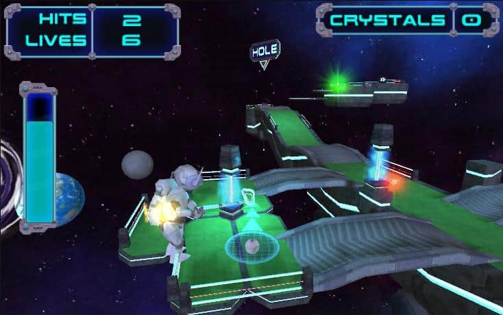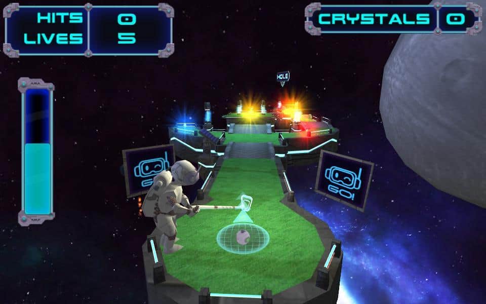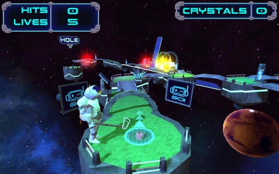 Astro Golf 4000 – гольф на андроид, где вы будете забивать мячи в открытом космосе. Эта игра перенесет вас в необычное место для гольфа, где вы будете одним метким и точным ударом забрасывать мячик в лунку. Покажите все на что вы способны и продемонстрируйте свою меткость, точность и сноровку. Рассчитывайте силу удара и траекторию полета мяча, при этом учитывая гравитацию космического пространства. Обходите все преграды на своем пути в виде энергетического щита, лазера и других. По пути собирайте все кристаллы и получайте доступ к новым полям для гольфа. Игра порадует игроков 18 неповторимыми локациями, отличной физикой и легким управлением.