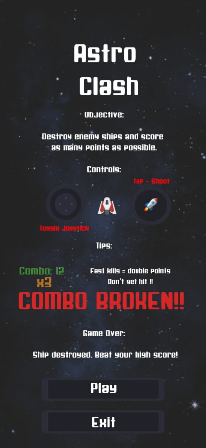 AstroClash — динамичный вертикальный шутер, где победа зависит от вашей скорости и хладнокровия. Стройте комбо-цепочки, умножайте очки и держите темп, ведь одно попадание обнуляет весь прогресс. Побеждайте волны врагов и боссов, собирайте аптечки и докажите, что способны удержаться на вершине рейтинга. Игра создана для тех, кто любит азарт, мгновенные решения и нарастающее напряжение каждого боя.