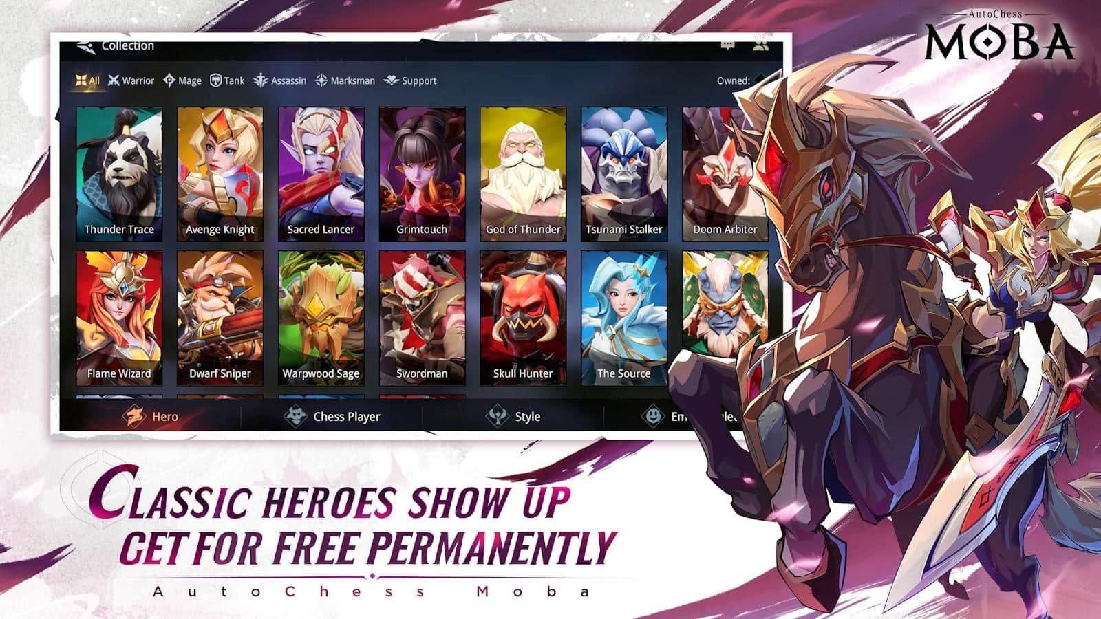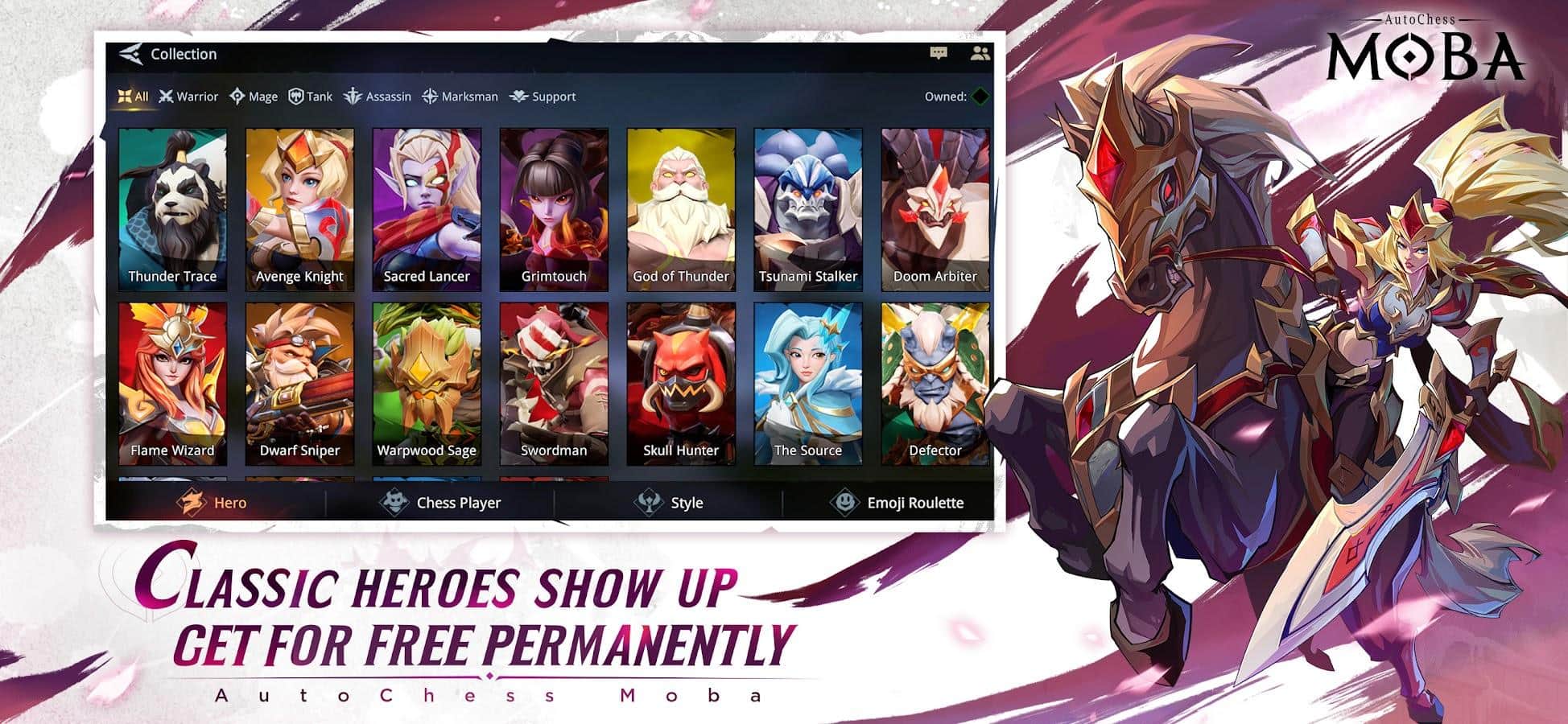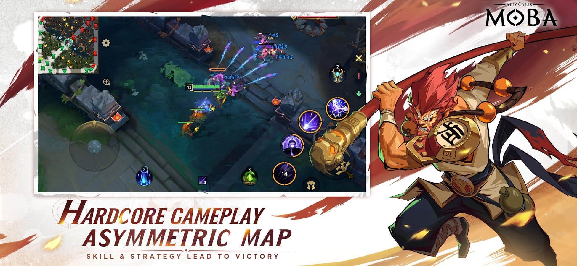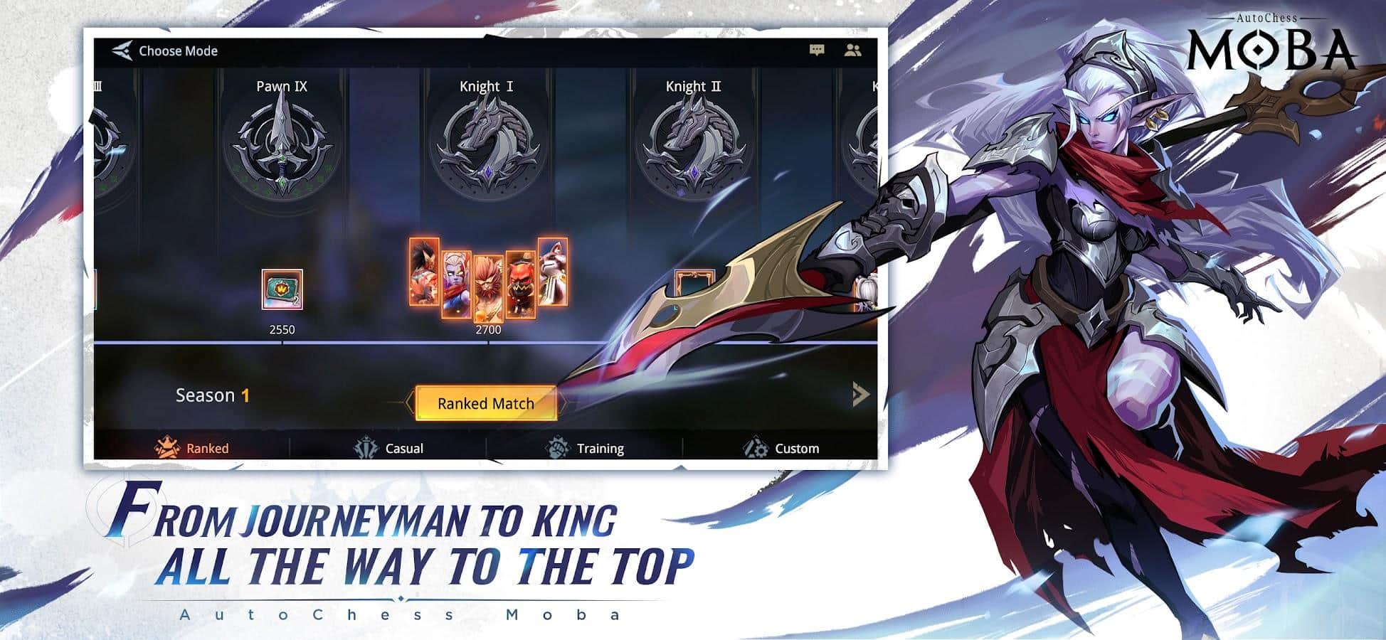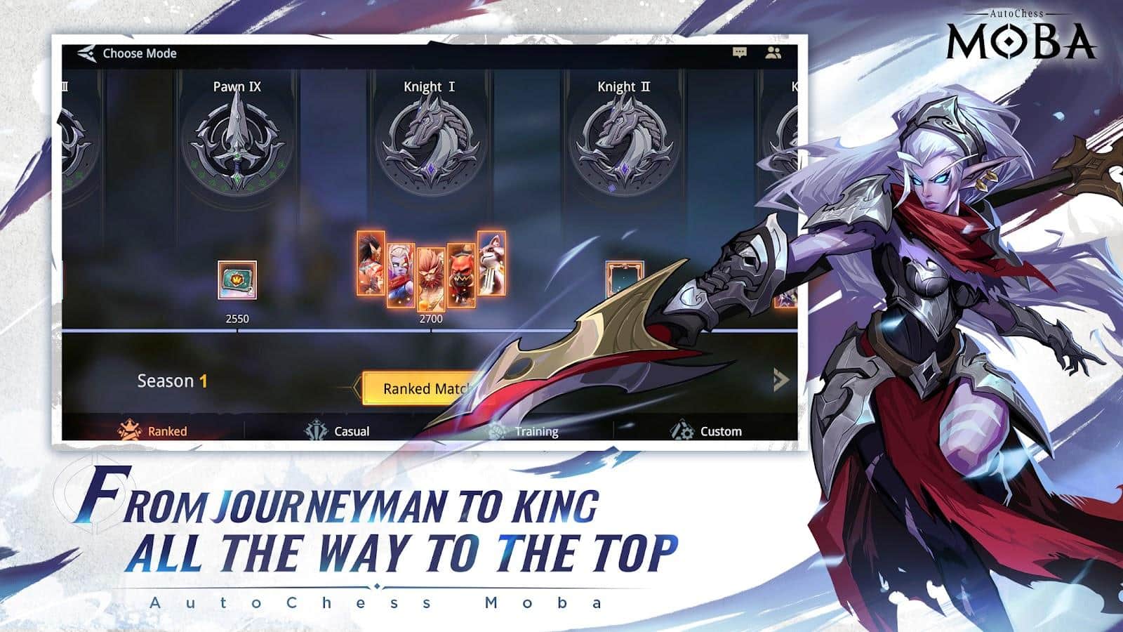 AutoChess Moba - Проявите весь свой скрытый потенциал на арене. Благодаря боям, особенно если они будут 5 на 5, вы сможете подняться по карьерной лестнице от статуса Подмастерье до самого высокого положения — Короля. Ко всему, узнайте лучшие и худшие стороны персонажей, среди них будут: топ-ланер, фланговый жнец, стремительный бродяга и другие.