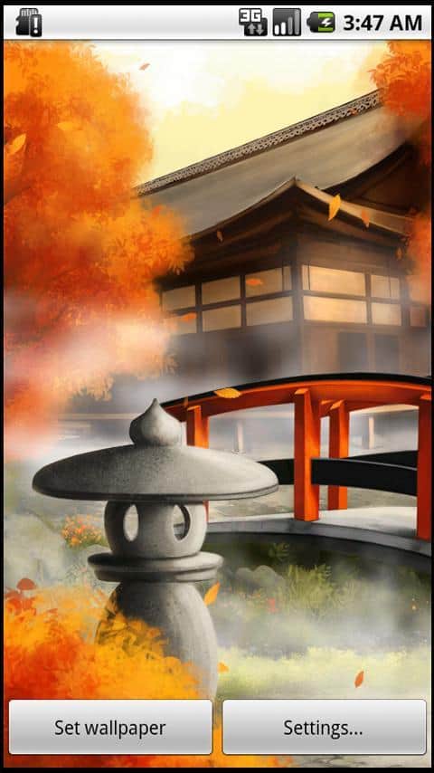 Осень Live Wallpaper – прекрасные живые обои для андроид от Jason Allen. Утреннее дыхание восточной осени. Легкий туман, падающие листья. Не напрягающие, легкие и не принужденные.
