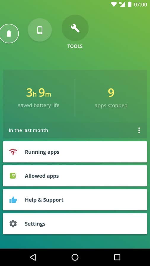 Приложение точно рассчитывает оставшийся до полной разрядки заряд батареи на основании анализа текущего использования устройства. В строке состояния виден индикатор заряда батареи