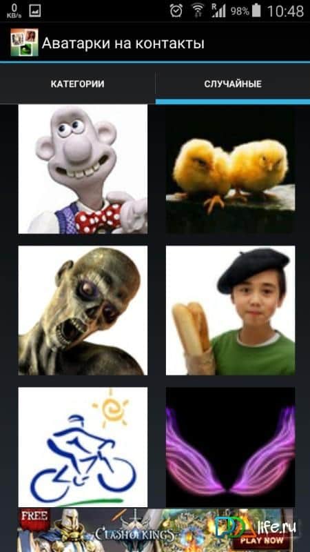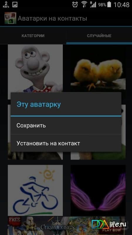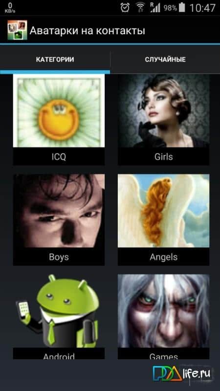 Аватар в современном понимании этого слова — наш образ в сети, именно поэтому мы уделяем так много времени и внимания его выбору. Чтобы не приходилось перерывать уйму картинок в интернете и собственных фотографий, можно просто установить данное приложение. Оно предоставляет доступ к обширной коллекции изображений, адаптированных под использование в качестве аватарок (размер изображений составляет 110х110 точек). Все имеющиеся картинки разбиты на тематические категории, а если не знаете что выбрать, можно воспользоваться случайным выбором. Понравившиеся можно либо сохранить и использовать позже по назначению, либо сразу установить на контакты, сохраненные в вашем смартфоне.