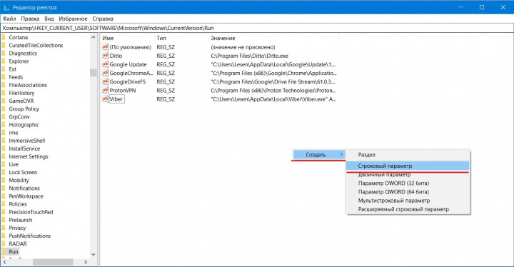 Если вы хотите добавить приложение в автозагрузку, нужно вызвать контекстное меню на свободном месте этого окна, Создать — Строковый параметр. Здесь нужно будет задать имя и полный путь к исполняемому файлу (формат .exe).