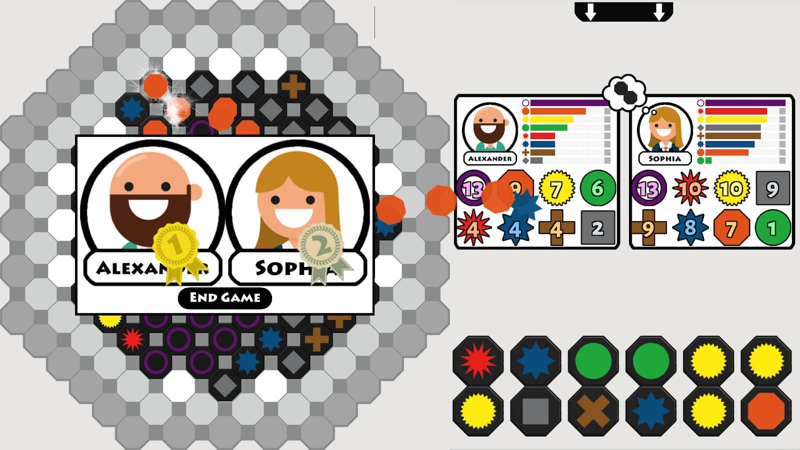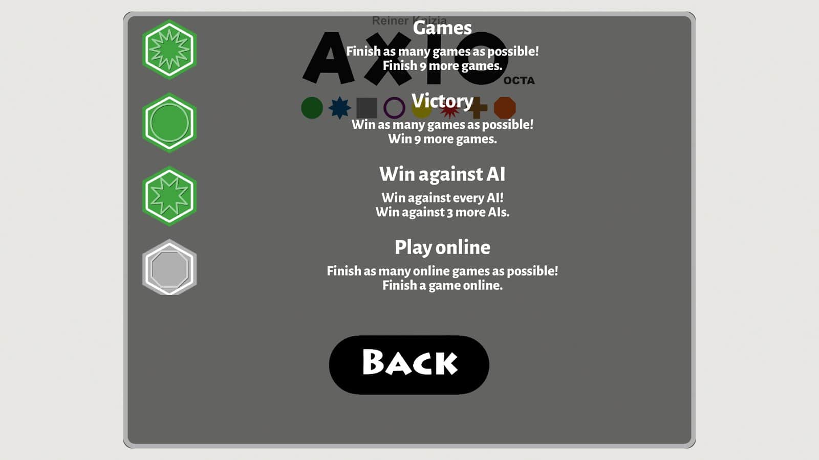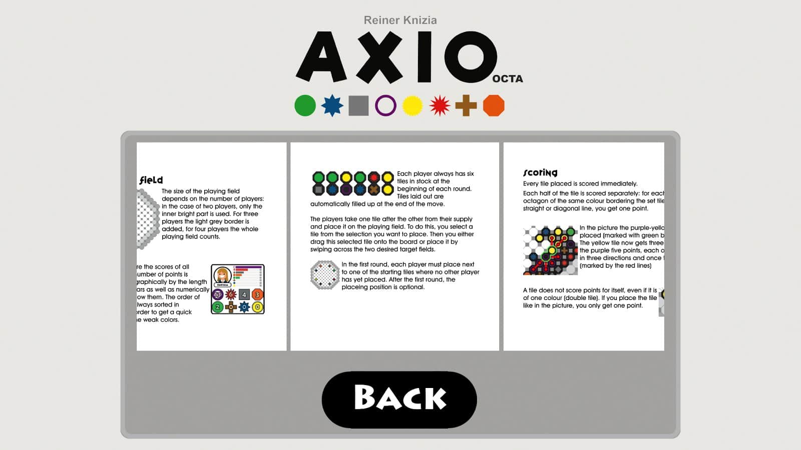 AXIO octa - настольная игра с пошаговым геймплеем в которой ваша задача шаг за шагом выкладывать на игровое поле разноцветные плитки, каждый цвет оценивается в определенное количество очков, чем больше плиток одного цвета находятся рядом тем больше очков вы заработаете. Главная цель игры получить наибольшее количество очков. Игровая механика сочетает в себе целый ряд элементов из различных настольных игр, при этом разработчикам удалось довольно гармонично объединить все элементы в одной игре.