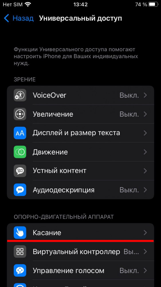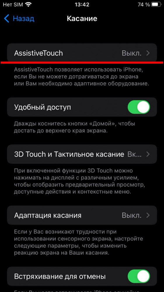 Если ваше устройство в порядке, а физические кнопки неисправны, можно использовать только экран для перезапуска или выключения. Здесь нам на помощь придут специальные возможности. Эта опция нужна для того, чтобы управлять устройством вообще без физических кнопок, только касаниями. Переходим в Настройки — Универсальный доступ — Касание — Assistive Touch и активируем переключатель. Отсюда можно заменить нажатие на неработающую клавишу прикосновением или вывести в Меню верхнего уровня перезагрузку.