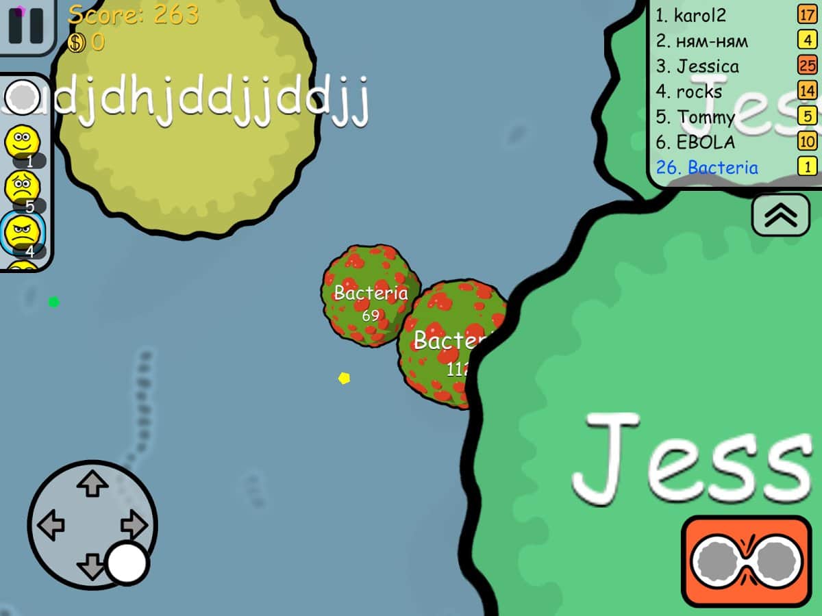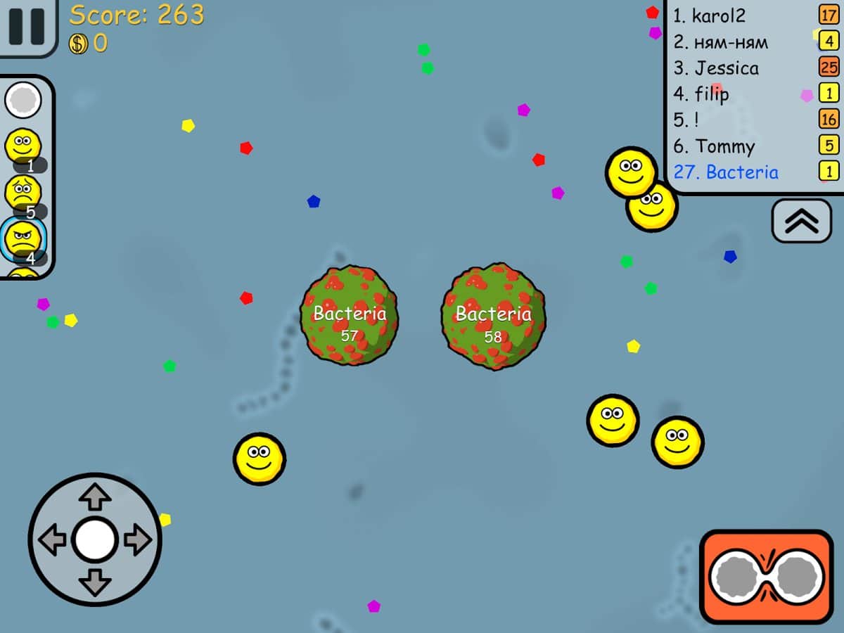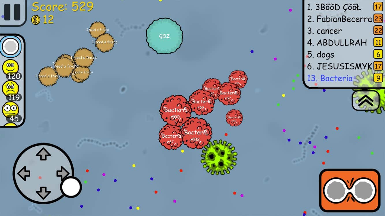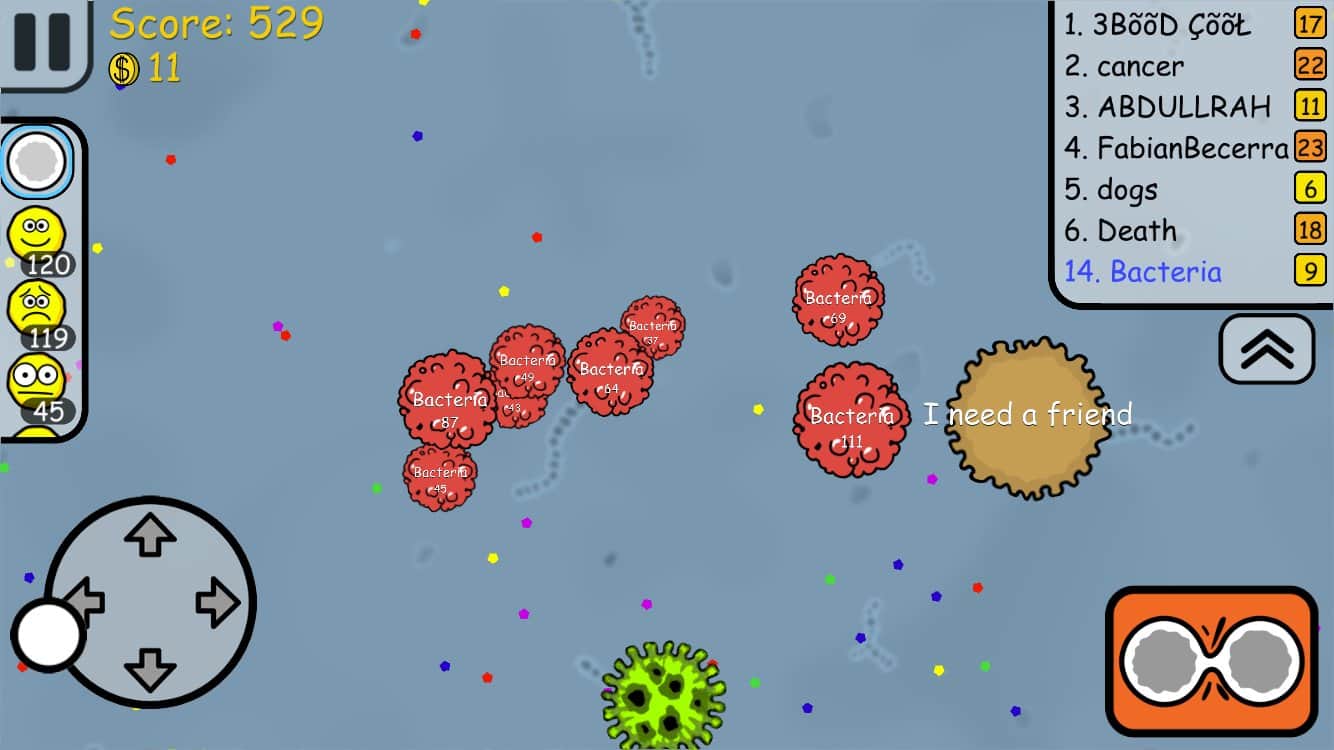 Bacteria World: Agar - динамичная аркада с элементами тактической стратегии, действия которой развиваются в микромире, в мире бактерий и микробов. В целом основная цель игры выглядит довольно просто, стать самой большой бактерией, поедая представителей микромира поменьше. Но на практике все оказывается намного сложнее, ведь на самую большую бактерию всегда найдется еще больше, да и сам мир полон опасностей. Так что запасайтесь терпением, подключайте всю свою сноровку и в бой. Игровой процесс сочетает элементы аркады и стратегии, ведь для успешного достижения цели вам предстоит планировать свои действия. Помимо возможности сравнить свои достижения в онлайн таблице лидеров, в Bacteria World: Agar для Андроид присутствует полноценный мультиплеерный режим, в котором вы сможете сразиться с другими игроками.