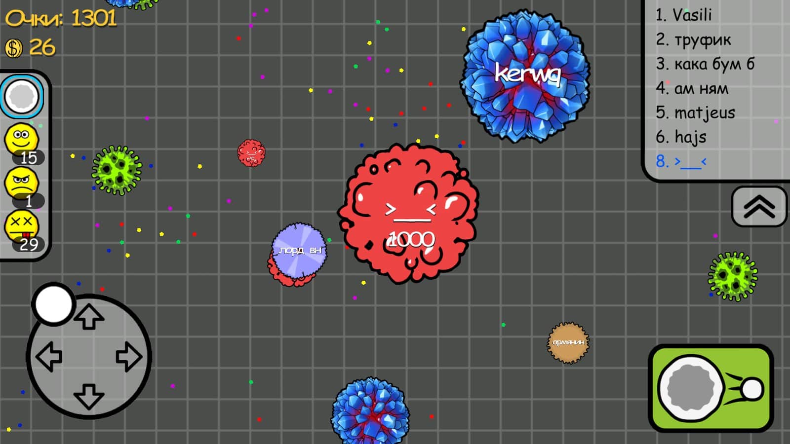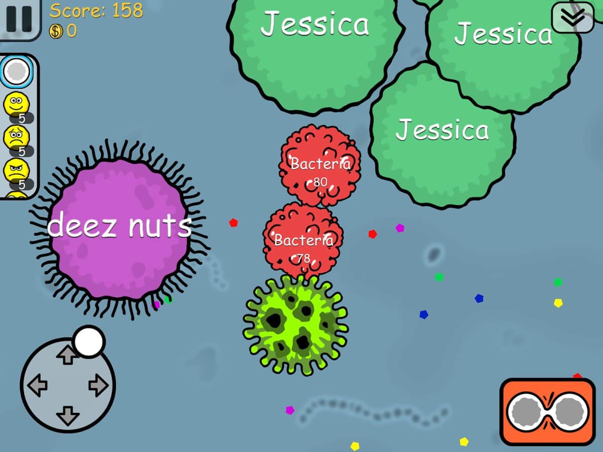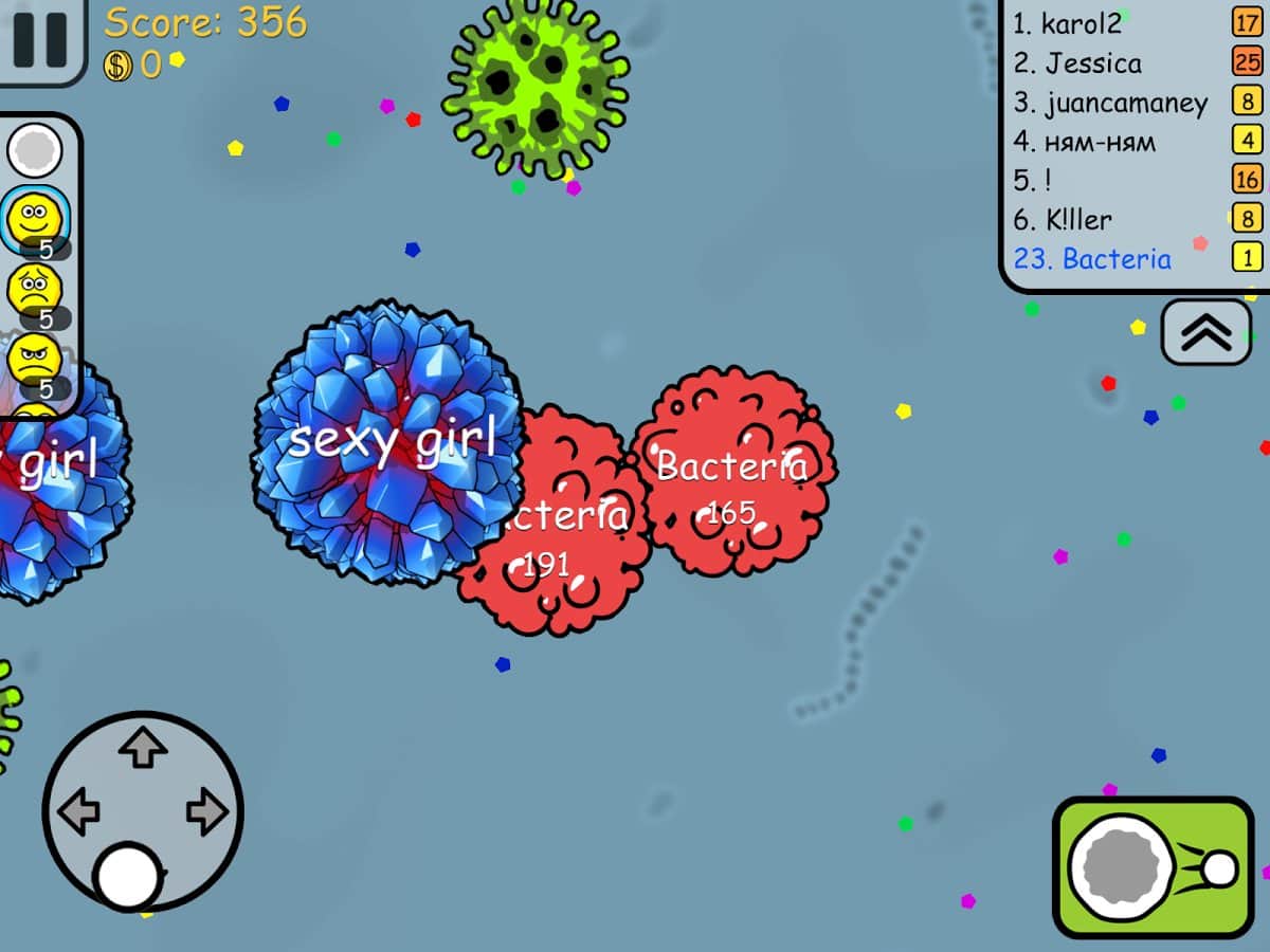 Bacteria World: Agar - динамичная аркада с элементами тактической стратегии, действия которой развиваются в микромире, в мире бактерий и микробов. В целом основная цель игры выглядит довольно просто, стать самой большой бактерией, поедая представителей микромира поменьше. Но на практике все оказывается намного сложнее, ведь на самую большую бактерию всегда найдется еще больше, да и сам мир полон опасностей. Так что запасайтесь терпением, подключайте всю свою сноровку и в бой. Игровой процесс сочетает элементы аркады и стратегии, ведь для успешного достижения цели вам предстоит планировать свои действия. Помимо возможности сравнить свои достижения в онлайн таблице лидеров, в Bacteria World: Agar для Андроид присутствует полноценный мультиплеерный режим, в котором вы сможете сразиться с другими игроками.