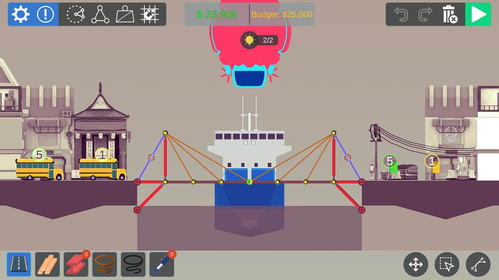 Bad Bridge – симулятор на андроид, с реалистичной физикой. Играйте в эту игру и подключайте свою сообразительность и творчество чтобы из различных материалов собрать мост. Спроектируйте и создайте свои конструкции так чтобы по ним спокойно могли проехать машины и грузовики. Если вы не будете учитывать при строительстве различные параметры и особенности конструкции, то вы будете наблюдать как машины и другая техника падает вниз и разбивается. Стройте мосты через обрывы и пропасти и учитывайте законы физики, а также прибегайте к помощи подсказок. Также в этой игре вы найдете режим песочницы где вы сможете создавать свои уровни и головоломки.