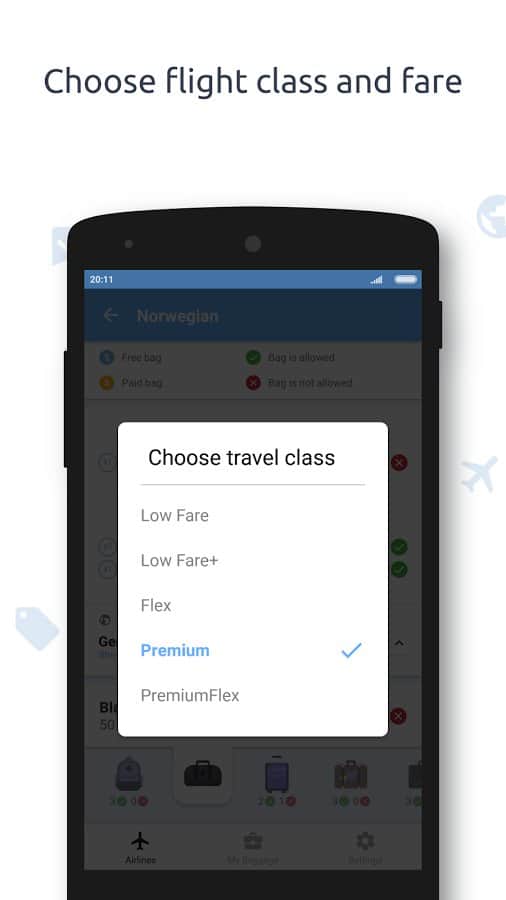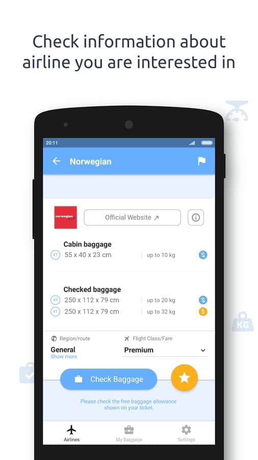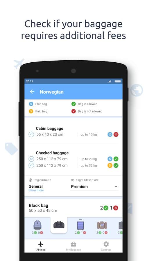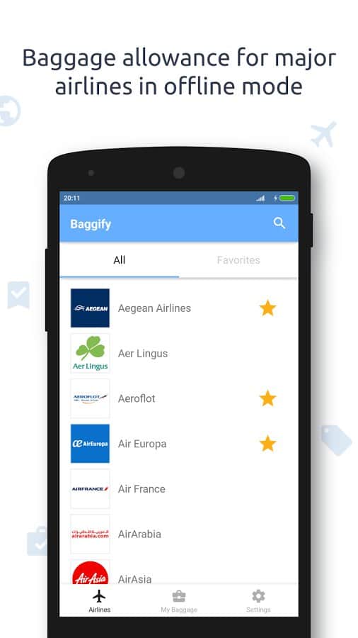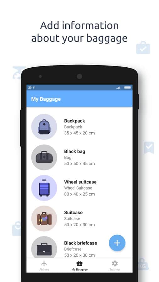 Baggify - airlines baggage allowance - приложение позволит вам убедиться в том, что размер вашей сумки предназначен для бесплатного перелета в самолёте определённого класса. Также вы без труда можете узнать, сколько сумок бесплатно вы можете перевезти и сколько нужно заплатить, если ваш багаж не соответствует нормам. Программа получает информацию от самых известных авиакомпаний, услугами которых мы зачастую пользуемся. Круглосуточная служба поддержки быстро ответит на все интересующие вас вопросы о перелёте и добавит вашу авиакомпанию в список приложения, если на данный момент она там отсутствует.