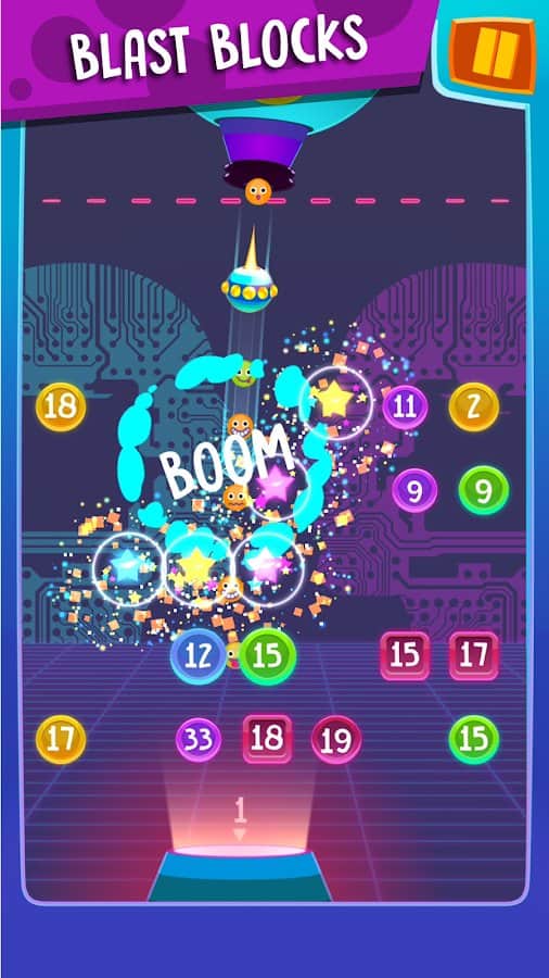 Ball Blast! – увлекательная игра на андроид, где вы будете разбивать круги и блоки с помощью своей пушки. В этой игре вы станете на защите своей пушки от медленно приближающихся блоков. Стреляйте по ним как можно точнее и наблюдайте за тем, как блоки разлетаются на мелкие кусочки. Играйте в эту игру в любое свободное время под звуки ксилофонной музыки. Не дайте своему шарику исчезнуть с экрана и для этого точно просчитывайте траекторию его полета. Открывайте для себя новые уровни, которые будут становиться все сложнее и устанавливайте свои рекорды.
