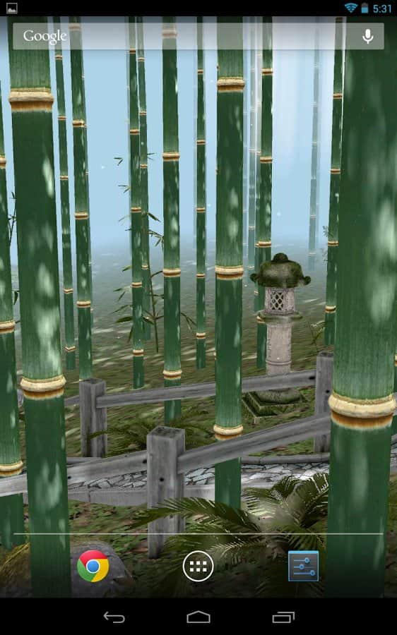 Бамбуковая роща 3D на живых обоях для андроид устройств от разработчика Axiomworks, Inc. будет мерно покачиваться под силой ветра. Если повезет, то вам могут повстречаться пролетающие бабочки между стволами мощного зеленого бамбука. В целом интересные и не напрягающие.