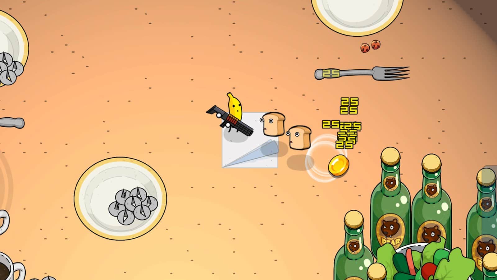 Banana Gun Roguelike - Вскоре банановая пальма и ее друзья-фрукты поняли, что им нужно объединить свои способности и пойти в бой против монстров, которые угрожали их миру. Банан с уверенностью взял в руки оружие, готовясь к сражению. Вступив в битву, он руководил командой фруктов, использовав их специальные приемы и навыки, полученные от него. Возьмите пушку и пойдите вперед против монстров, ведя эту эпическую историю браней и дружбы.
