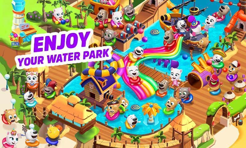Бассейн Говорящего Тома – увлекательная и веселая игра на андроид, где вы вместе с говорящим Томом и его друзьями отправитесь в аквапарк. Начните свое приключение прямо сейчас и плескайтесь в бассейне вместе с другими героями игры и заставляйте их ударятся друг об друга. Эта игр порадует вас уникальной механикой «рогатки» где вы будете оттягивать надувной круг отпускать его и тем самым сталкивать с другими кругами, такого же цвета. Вашей задачей будет за минимальный промежуток времени очистить весь бассейн от кругов и заработать ключ. Прибегайте к помощи бонусов и усилений в виде ракет и круга-единорога, которые позволят вам быстрее пройти уровень. Используйте ключи для строительства, улучшения или открытия нового аквапарка. Плескайтесь в бассейне с такими героями как говорящий Том, Анджела, Хэнк, Бен и Джинджери и весело проводите свое свободное время.