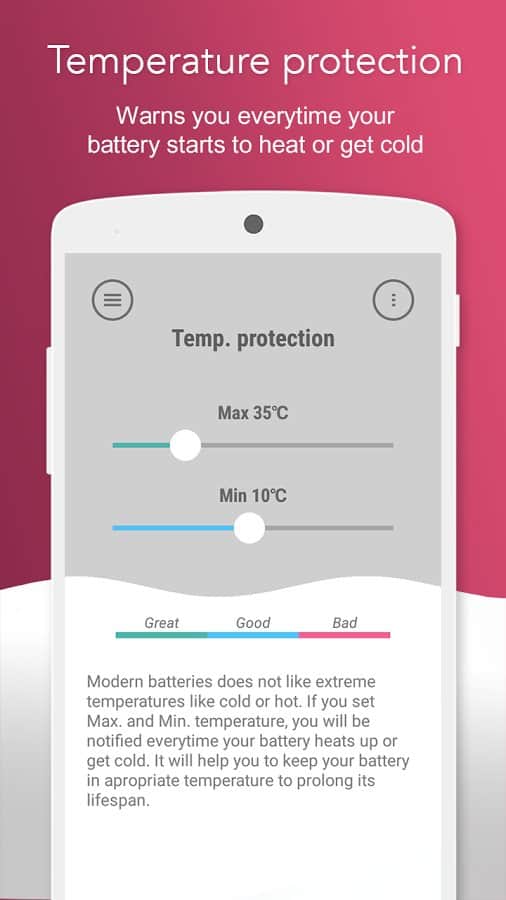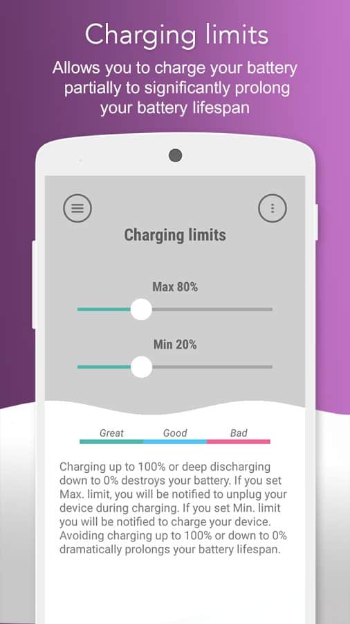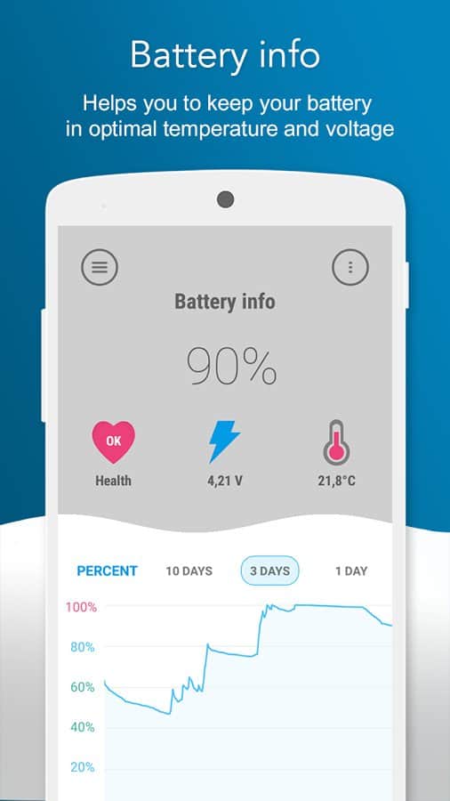 Battery Lifespan Extender - Поддерживайте свою батарею в хорошем состоянии с помощью одного простого приложения. Максимальная зарядка и разрядка батареи может её испортить, а так же мало кто знает но батарея тоже имеет свои режимы работы. Данные режимы можно контролировать вручную с помощью этого приложения, следить за её работоспособностью и не давать перегреваться. Наше приложение дает вам общий обзор уровня заряда и температуры батареи, а также информацию о состоянии батареи, ее напряжении и температуре в режиме реального времени.