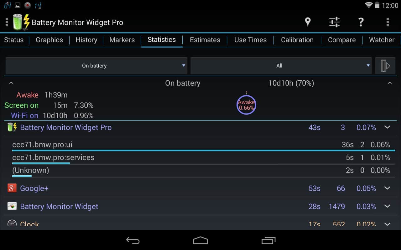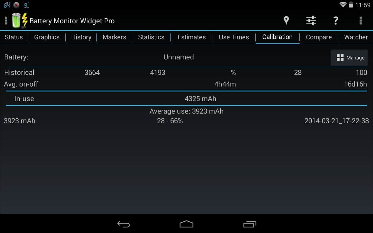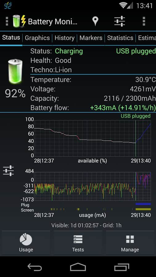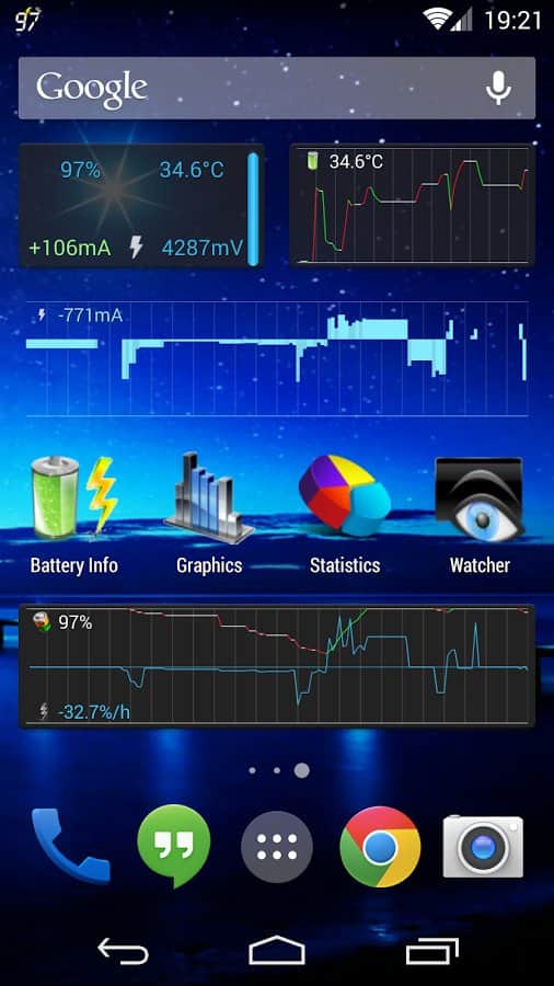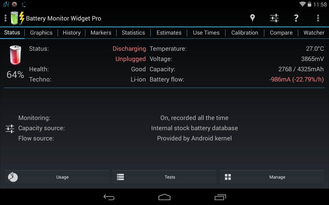 Battery Monitor Widget – хороший виджет батареи для андроид от разработчика 3c. Приложение проведет мониторинг аккумулятора и выдаст данные по следующим позициям: ёмкость, заряд/разряд (mA и mW), напряжение, температура. Так же вы можете просмотреть историю и прокручиваемые или масштабируемые графики, есть возможность настройки сигнала тревоги и калибровки батареи. Следует отметить, что само по себе приложение крайне мало потребляет заряд.
