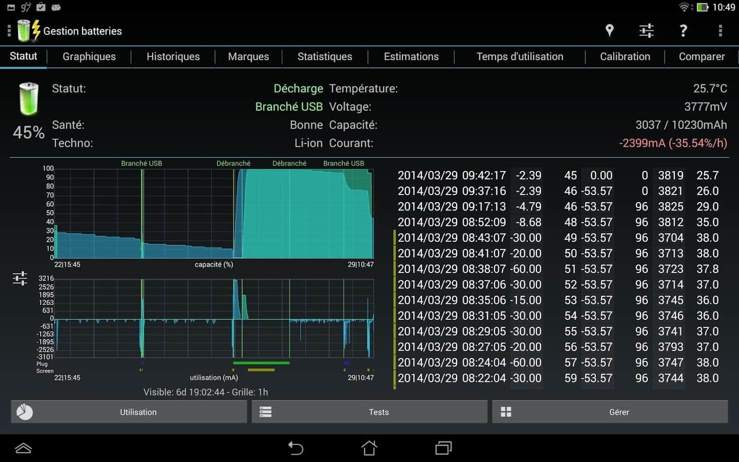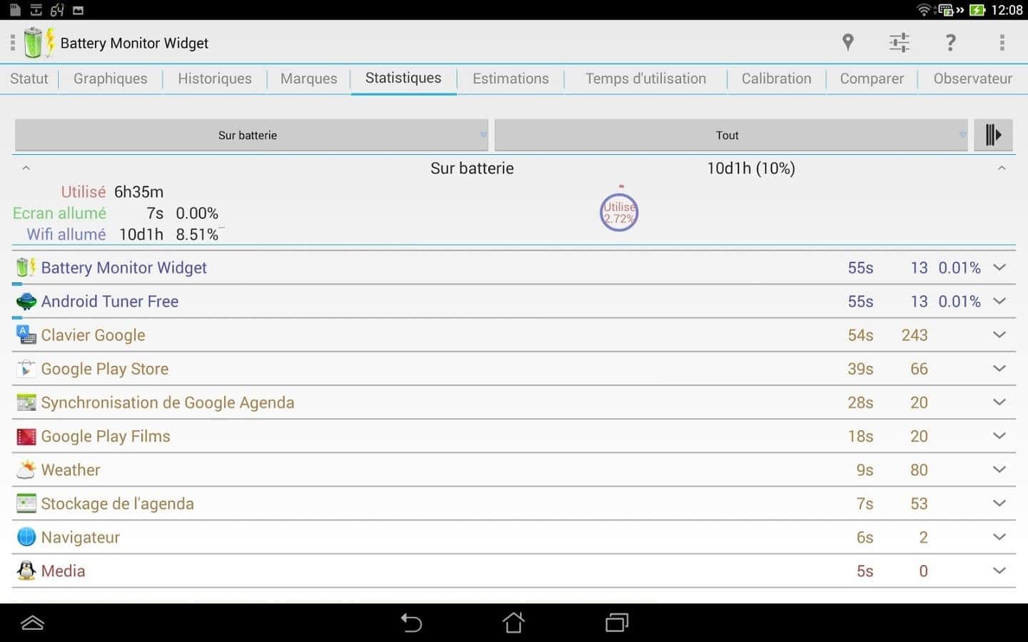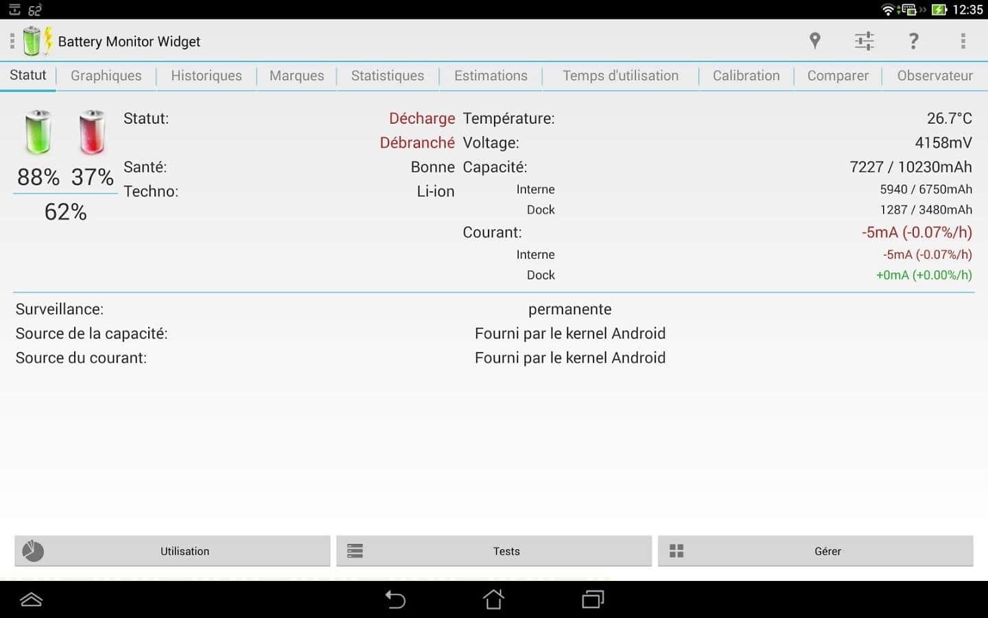 Battery Monitor Widget – хороший виджет батареи для андроид от разработчика 3c. Приложение проведет мониторинг аккумулятора и выдаст данные по следующим позициям: ёмкость, заряд/разряд (mA и mW), напряжение, температура. Так же вы можете просмотреть историю и прокручиваемые или масштабируемые графики, есть возможность настройки сигнала тревоги и калибровки батареи. Следует отметить, что само по себе приложение крайне мало потребляет заряд.