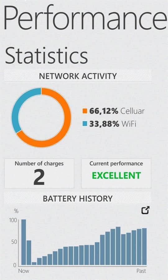 Battery Performance - приложение для windows phone, которое позволяет проверить заряд аккумулятора на вашем телефоне. Программа показывает основные характеристики и информацию о времени работы батареи. Теперь стало очень удобно отслеживать заряд батареи на вашем устройстве и у вас не сядет телефон в самое не подходящее время.