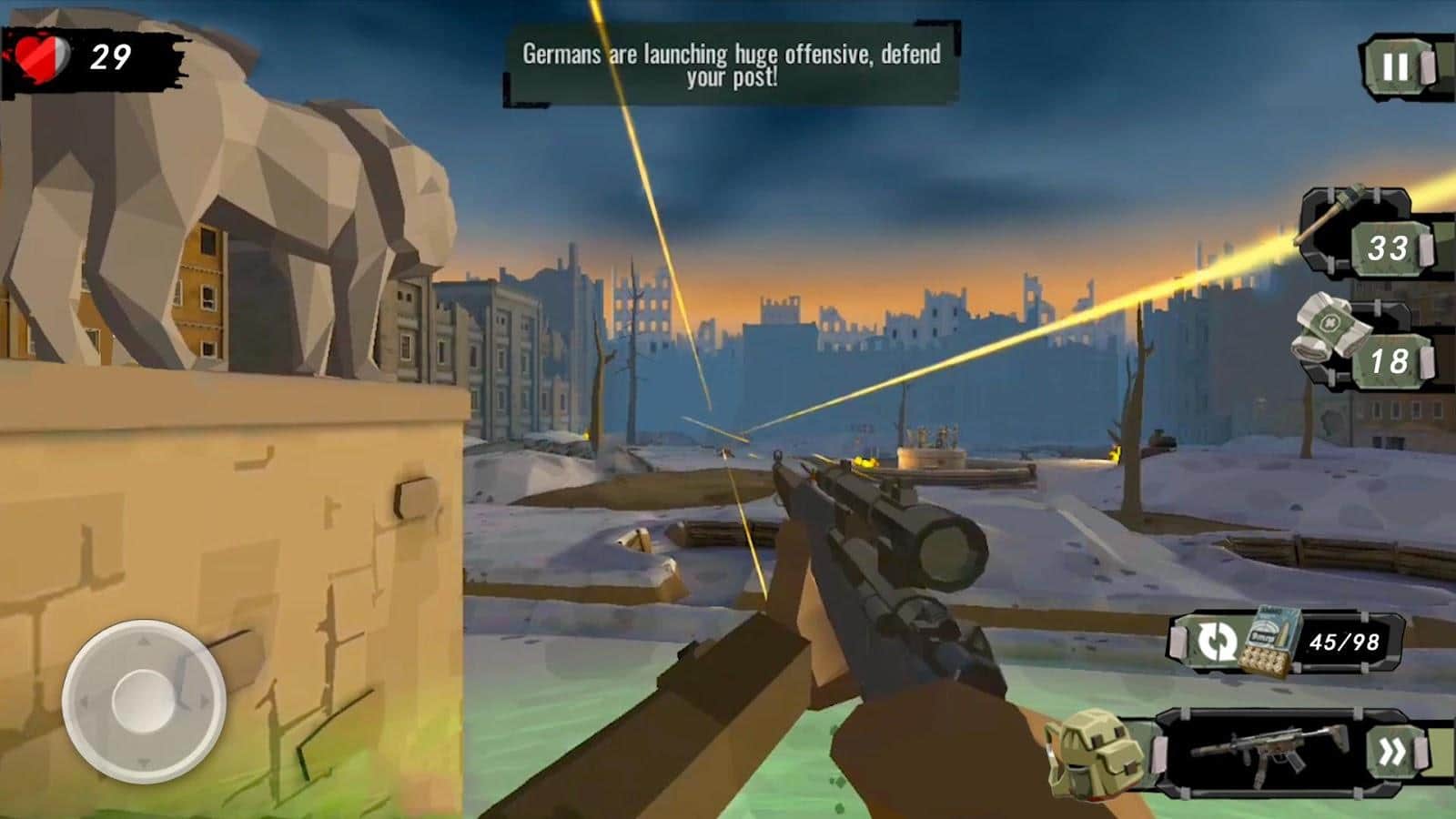 Battle Heroes - Survival in WW2 – одиночная FPS игра на андроид, сделанная по битвам Второй мировой войны. В этой игре вы пройдете путь отважных советских солдат и вместе с ними совершите героические поступки. Начните свою битву с Нормандии и заканчивайте при Арденнах и в Берлине. Пройдите весь Восточный фронт и испытайте себя на прочность при Сталинградской битве и в сражениях в Восточной Европе. Вступайте в бой с опасными и отчаянными врагами и не дайте им победить вас. Применяйте в битве многочисленное и разнообразное оружие, расходные материалы и другое снаряжение.
