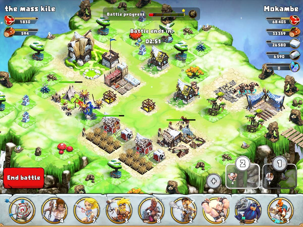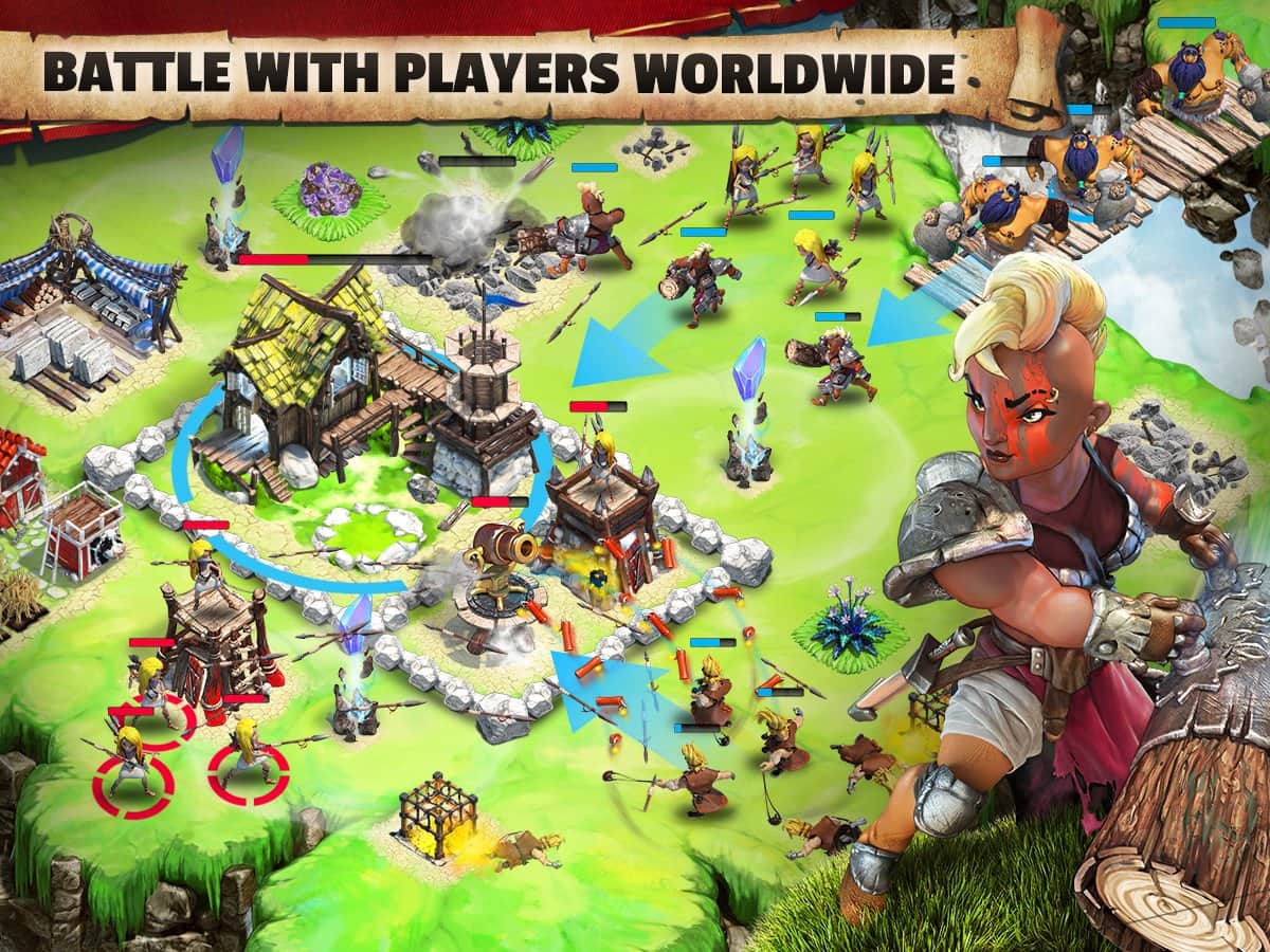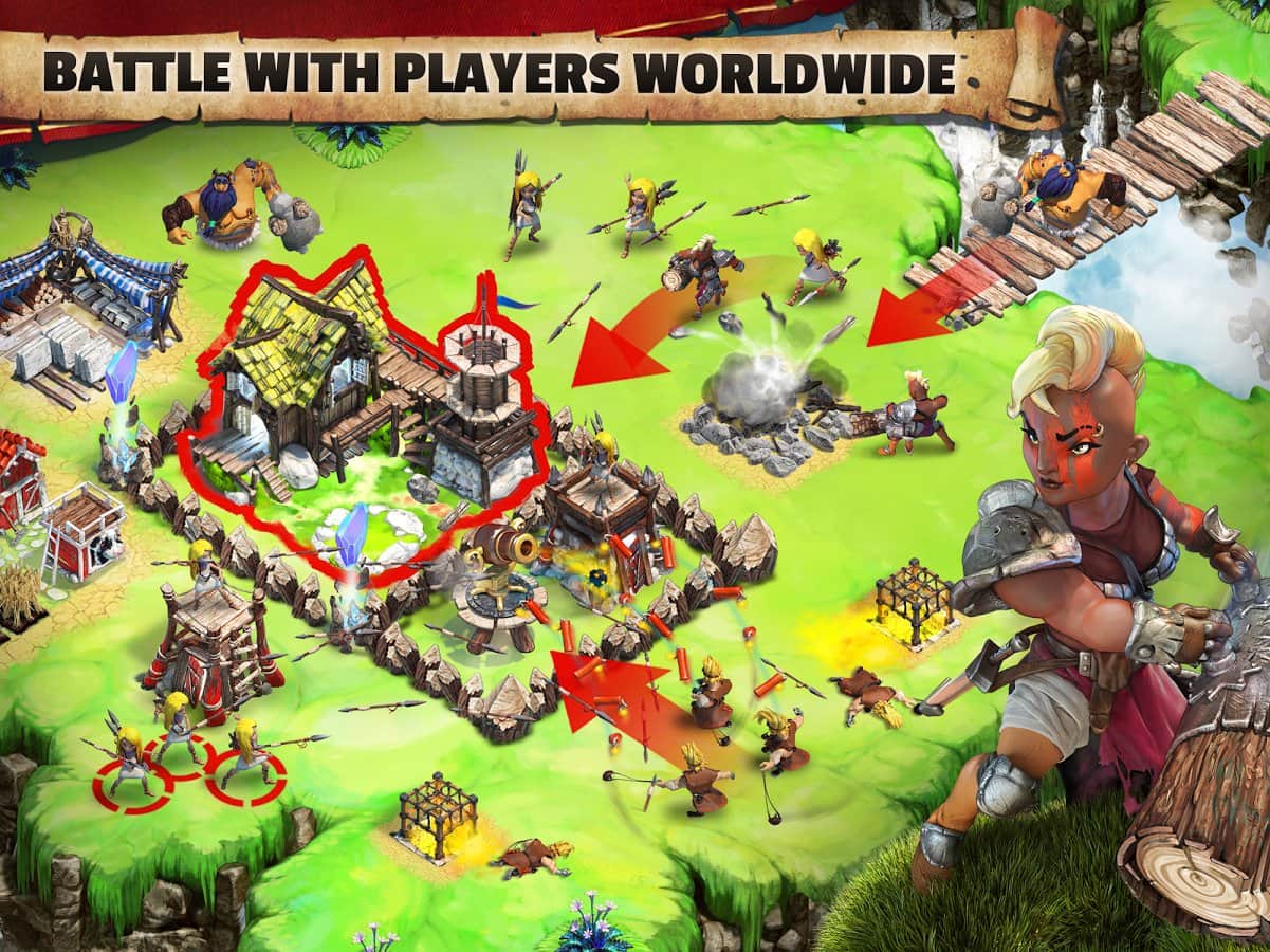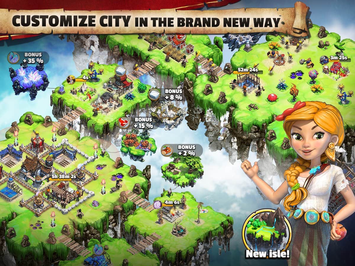 Battle Skylands – стратегия на андроид, где вы посетите летающие острова парящие в небе. В этой игре вашей задачей будет на одном из парящих островов построить небольшую деревню и развивать ее. Добывайте ценные ресурсы, стройте защитные сооружения и собирайте огромную армию, чтобы защититься от врагов которые хотят захватить вашу деревню. Добывайте древесину, камни, железо и другие ресурсы которые пригодятся вам для строительства и изготовления оружия. Защитите жителей своего поселения от опасностей и врагов, а также собирайте походы и нападайте на соседние деревни, которые находятся неподалеку от ваших островов. Сражайтесь с игроками со всего мира и играйте с друзьями.