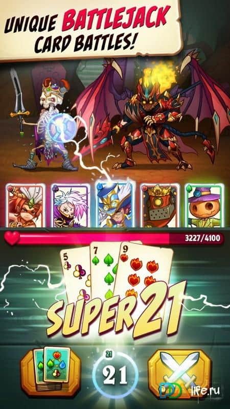 Battlejack – составьте свою непобедимую коллекцию из уникальных героев и монстров. Соберите все карты и сражайтесь против сильных врагов пытаясь набрать 21 очко и атаковать врагов. Путешествуйте по фантастическому миру игры и собирайте коллекцию карт, которая будет состоять из героев, которые обладают уникальными способностями и атаками. Используйте умения каждого героя в бою и набирайте очки. По ходу игры не забывайте улучшать способности каждого героя. Играйте с друзьями и помогайте им победить злых монстров. Главными особенностями игры являются неповторимые миры с мрачными подземельями, многочисленные герои и захватывающие карточные сражения.