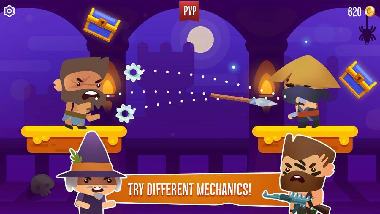 Battlemaster – захватывающая инди игра на андроид, где вы примите участие в захватывающих дуэлях с реальными игроками. Примите участие в баттл соревновании которое будет проходить на одном устройстве. Возьмите под свой контроль героя и бросайте вызов своему другу участвуя в перестрелках. Сражайтесь до двух побед одного игрока в трех раундах и зарабатывайте монетки открывая для себя новых героев и оружие. Положитесь на свою меткость и отличную реакцию и стреляйте в соперника. Также метьтесь в волшебные сундуки, которые скрывают в себе дополнительное оружие и бустеры. В этой игре вы будете стрелять из лука, устраивать дуэли на револьверах, битвы магов и дуэли на мечах.