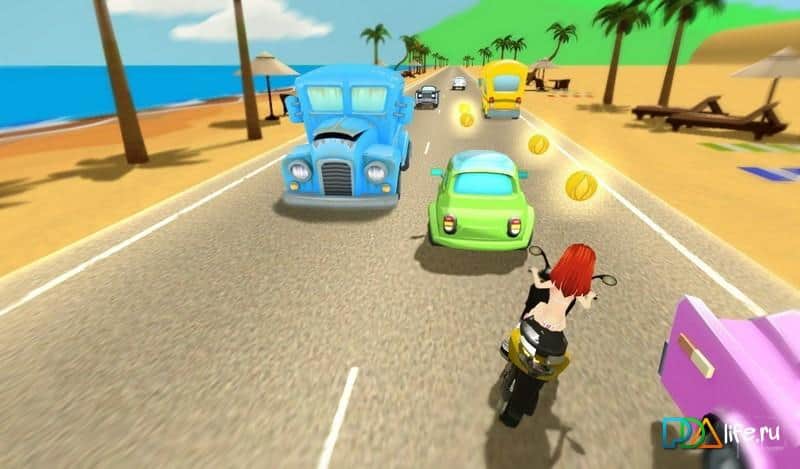 Beach Moto Racing – гоночный раннер на андроид, в котором вы будете управлять скутером и гонять по оживленной дороге. Эта игра вам навеет теплые воспоминания об уходящем лете, где вам предстоит ездить по дороге вдоль огромного песчаного пляжа. Управляйте скутером и наслаждайтесь приятной обстановкой, симпатичной девушкой и отличным саундтреком. Катайтесь по оживленной трассе и передвигайтесь влево и право, чтобы обойти весь бесконечный трафик из машин и собрать по пути как можно больше монет. Обновляйте ваш скутер или приобретайте новый из большого разнообразия представленных моделей.
