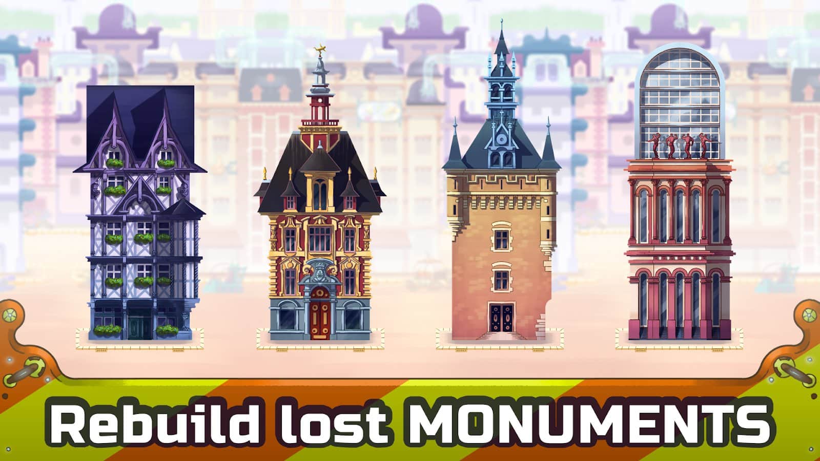 Нажимайте на музыкальные биты и постройте огромное количество старых зданий в разных городах всего мира. Защищайтесь от роботов, которые хотят разрушить ваши постройки. Прокачайте музыкальные способности: воспринимайте популярную музыку на слух, при этом закрывая глаза. Таких архитекторов как вы больше не найти, поэтому максимально правильно ставьте задачи роботам-помощникам и помогайте им. Если эта игра покажется слишком легкой, сможете ли вы получить 196 медалей за 64 уровня, а также сразиться с главным боссом?