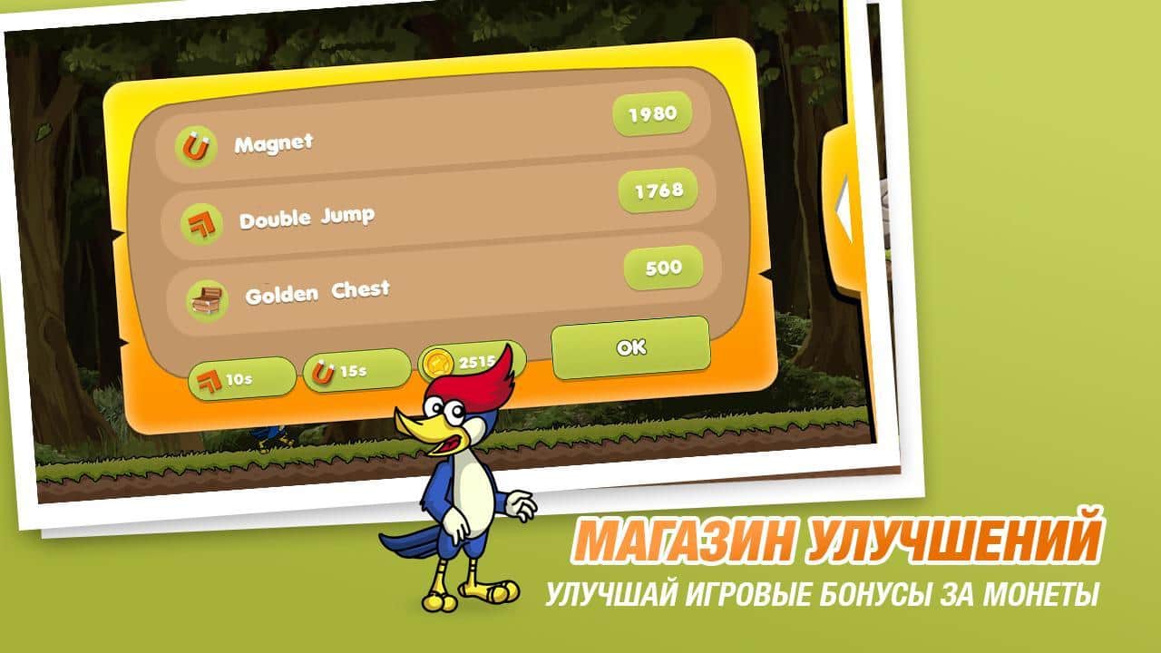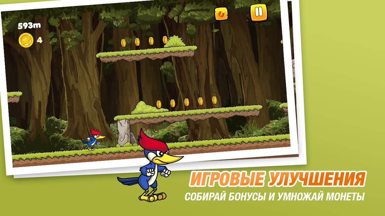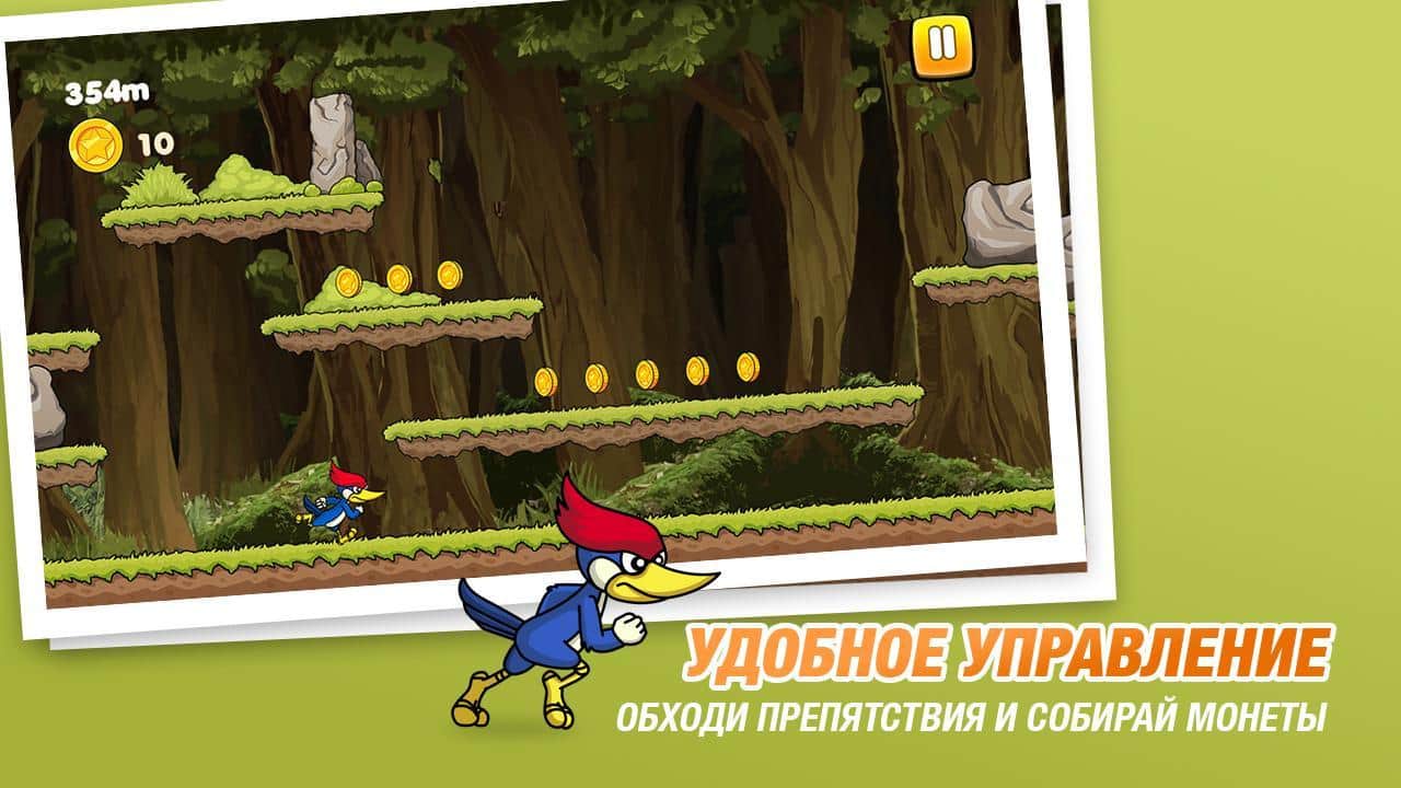Бегун Коди – раннер на андроид, где вы будете управлять бегущим дятлом. В этой игре вы возьмете под свой контроль дятла Коди и проведете его по всем локациям игры, взбираясь на платформы и собирая монетки. Ведите своего героя вперед и обходите стороной все преграды на пути. Старайтесь добраться до финиша за минимальный промежуток времени и установить свой рекорд в этой игре. По пути собирайте монетки и усиления и приобретайте на них в магазине многочисленные бонусы, которые помогут вашему дятлу в пути. Бегайте и прыгайте по красивым мирам и устанавливайте свой рекорд в этой игре.