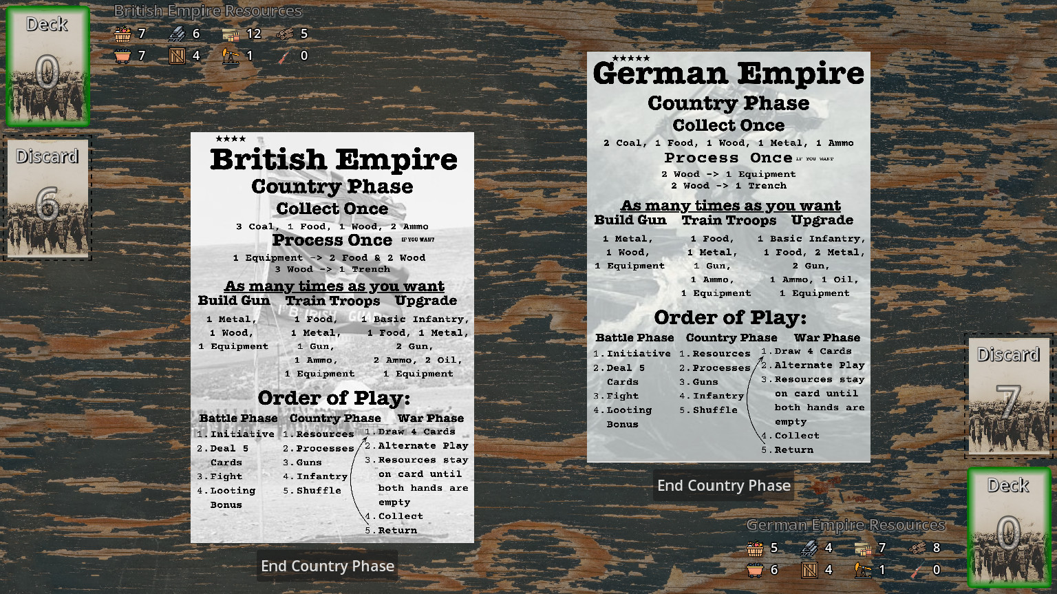 Фаза страны: каждая нация генерирует уникальные ресурсы, производит оружие и обучает солдат.