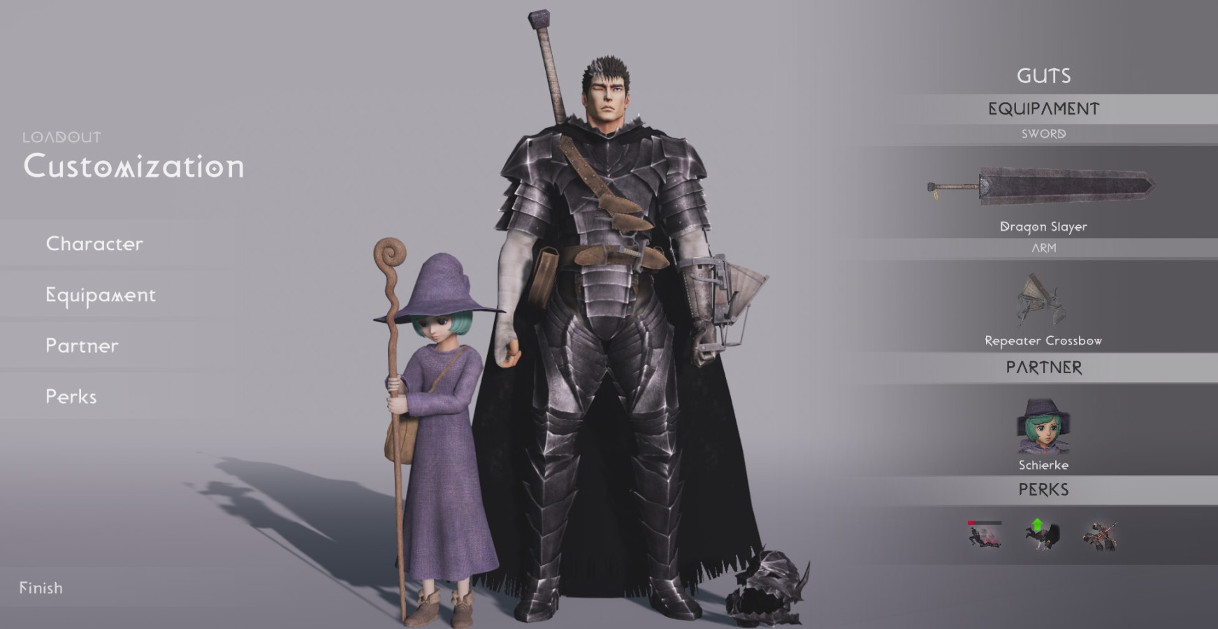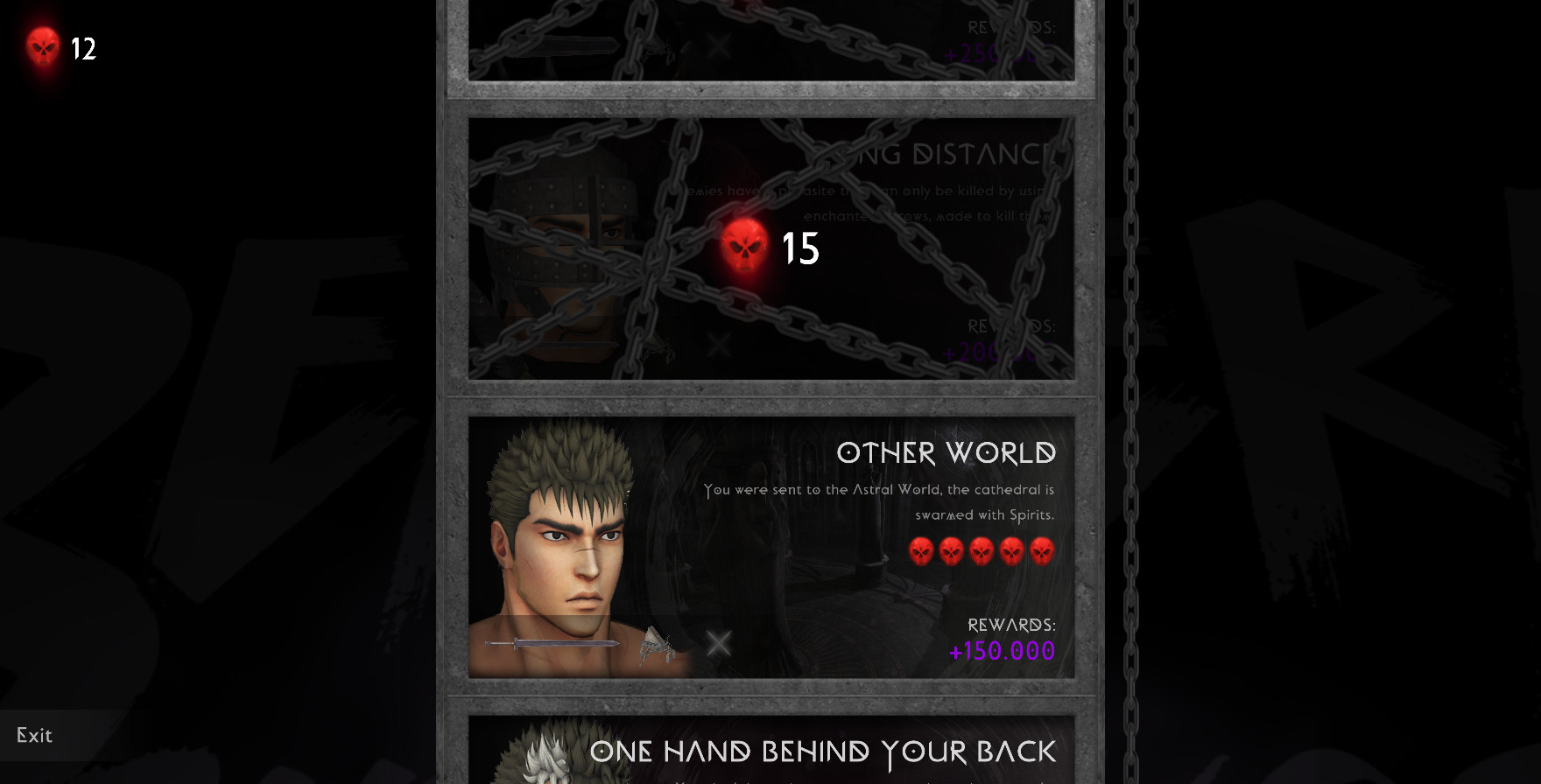Геймплей: тут собственно какой-то тир про Гатса, ходим бьём врагов, несколько режимов и смысла от них я так и не понял, в одном режиме типичный сурвайвал, но персонаж у нас никаким образом не развивается по ходу рубки мобов. Второй режим тоже самое, но задача дожить до конца таймера иначе не получаем валюты на открытие...скинов, перков и прочей практически бесполезной лабудени. С мобов выпадают какие огоньки, а для чего нужны они не ясно (только феолетовые типо валюта) Бонусом добавим сюда постоянную просадку ФПС и камера рандомно то переключающаяся в инверсию во время катки, то назад в нормальный её контроль.Крч хз как это оценивать вообще, и как в это на данный момент играть, ибо выглядит как демо рубка мобов при выборе персонажа в каком-то более масштабном проекте, но тут нет этого более массштабного... как-то так..