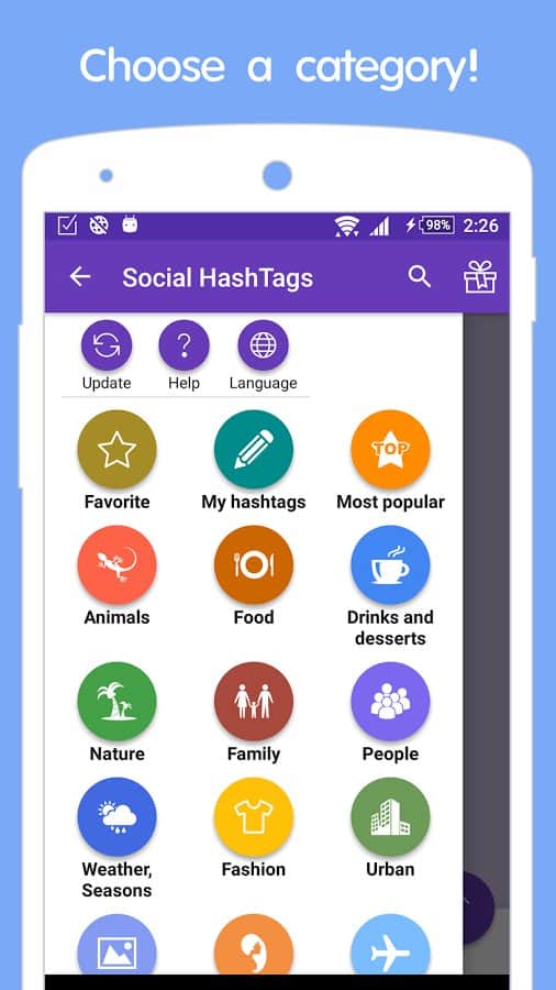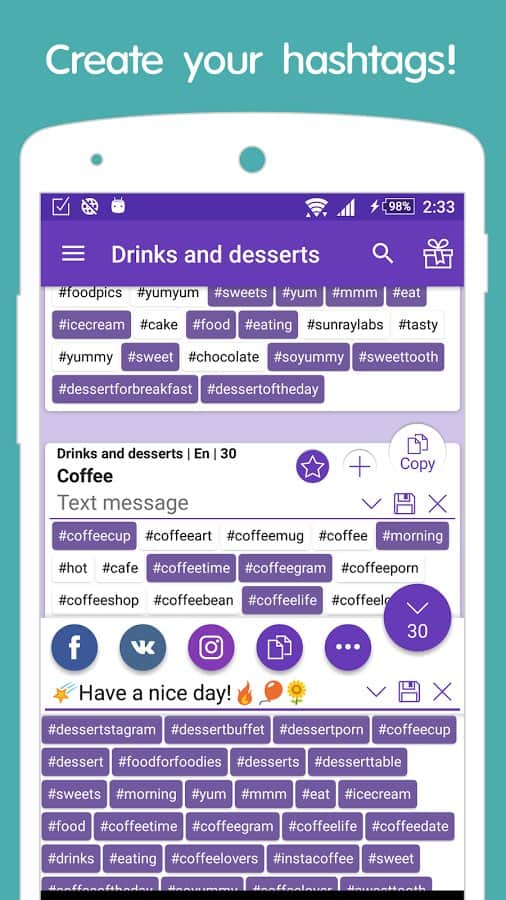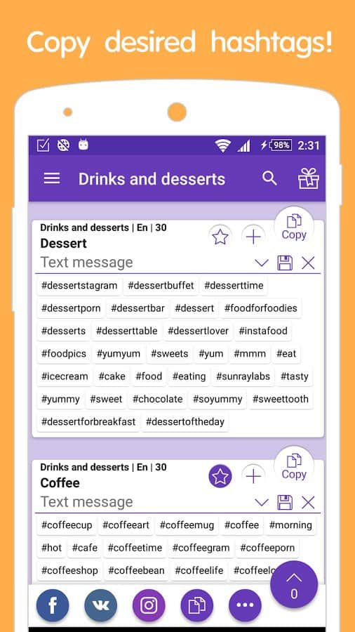 Отличное приложение, которое поможет быстро и правильно выбрать хэштеги для ваших фото в Instagram. Приложение так же поможет вам собрать как можно больше лайков к вашим фото, публикациям и конечно же подписки. Все что вам для этого нужно так это выбрать правильную категорию, скопировать понравившийся тэги и добавить под ваш пост. В приложении присутствует удобный поиск, поэтому вы сможете быстро и правильно подобрать именно то, что вам нужно. Так же вы сможете создавать собственные хэштеги и добавлять их в отдельный каталог для быстрого и удобного использования.