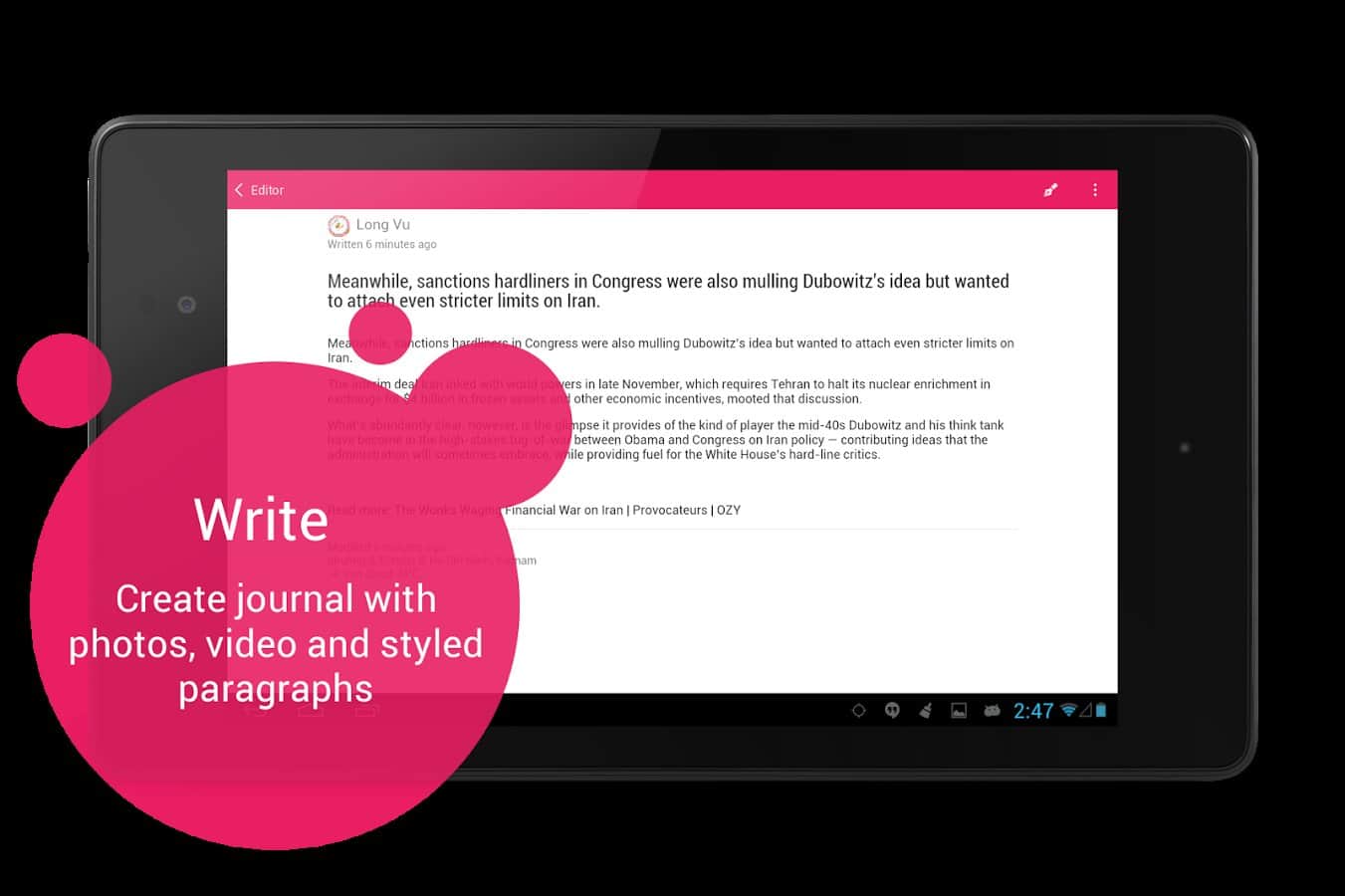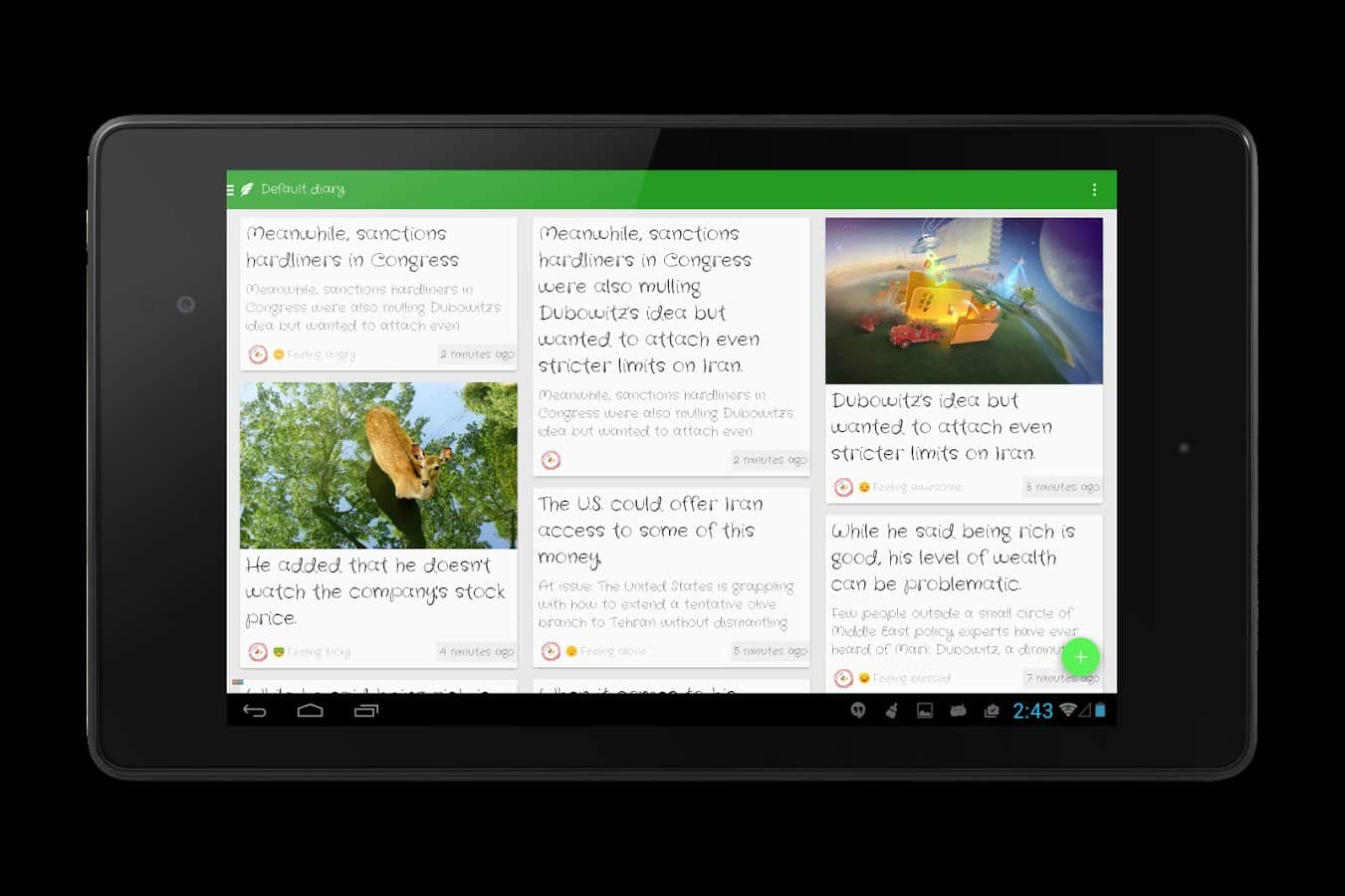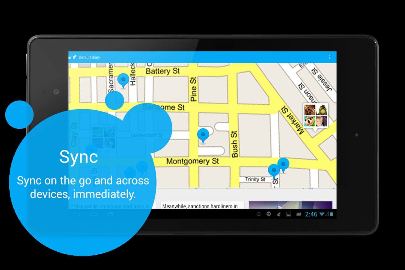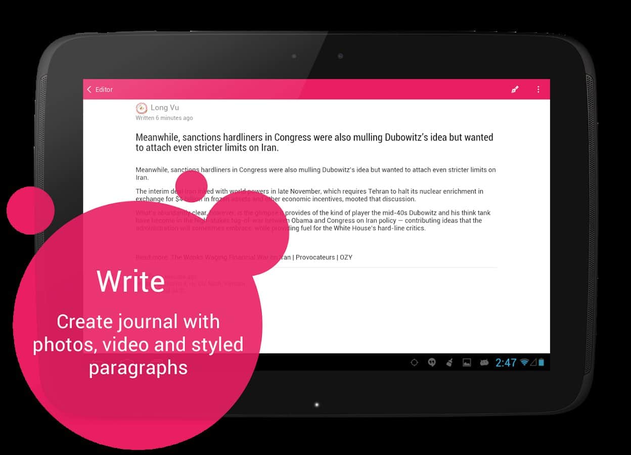 Полезная и красивая в оформлении программа-журнал. Большой редактор текста, возможность привязки события к месту(имеется карта).