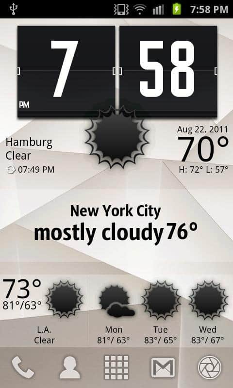 BeWeather состоит их 11 виджетов рабочего стола разного размера, включая электроныые часы с погодой. Имеется возможность индивидуальной настройки иконок, фона, шрифтов и цвета.