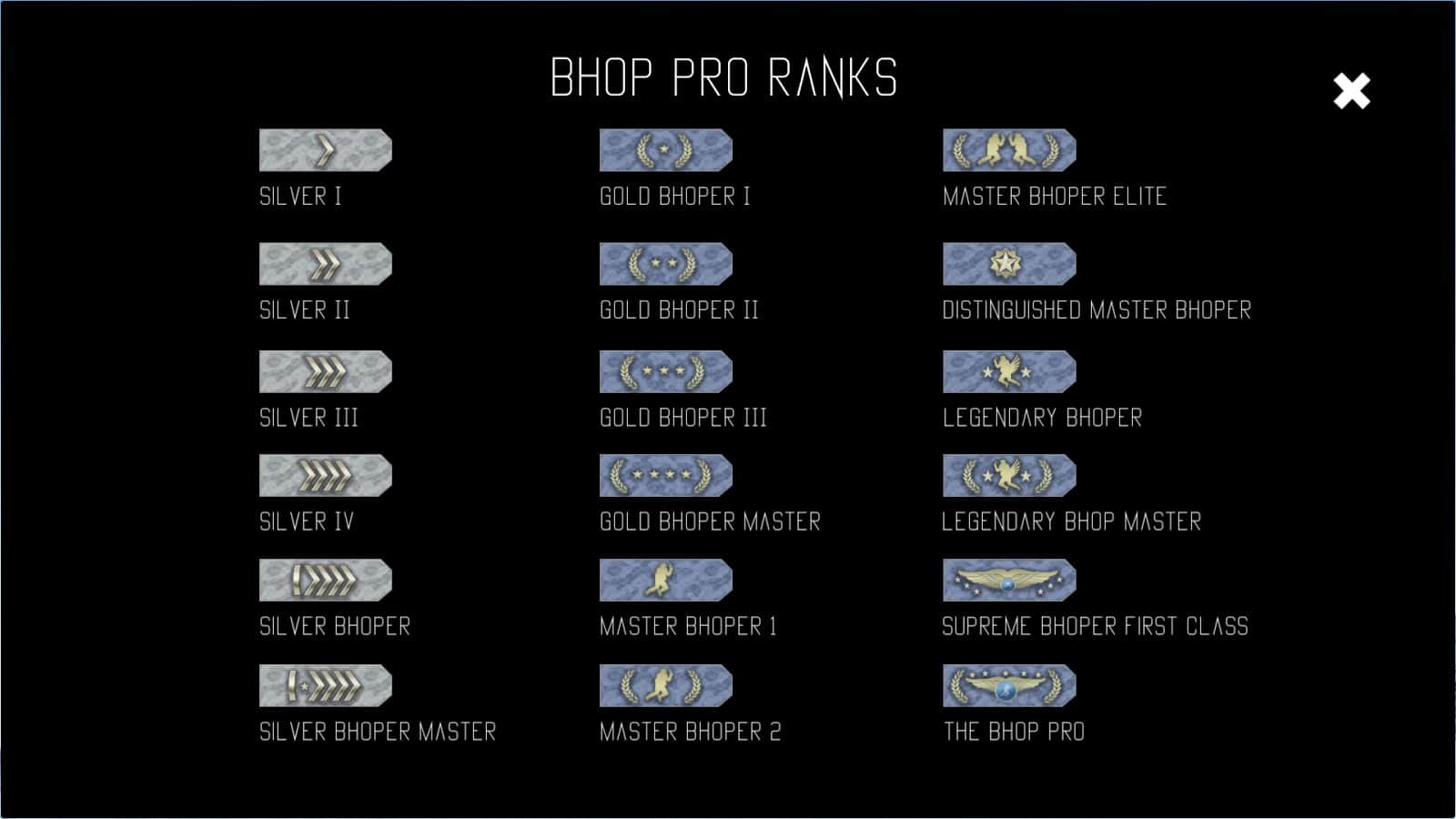 Во многих играх применяется специальная схема прыжков, способствующая существенному ускорению перемещения. Только вот освоить Банни хоп получается не у каждого, хотя он и дает сильное преимущество в игре. Теперь Bhop Pro поможет понять физику движений и научиться выполнять этот трюк практически в каждой игре. Пользуйся вспомогательными материалами и инструментами, лови темп и разгоняйся прыжками. Добейся лучшего результата в мировой таблице игроков и покажи свой профессионализм с опытом применения Банни хоп на практике!