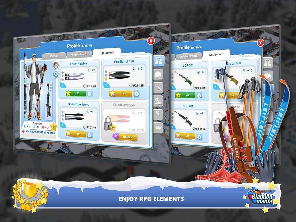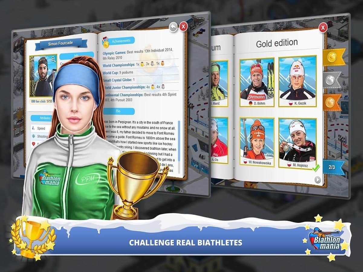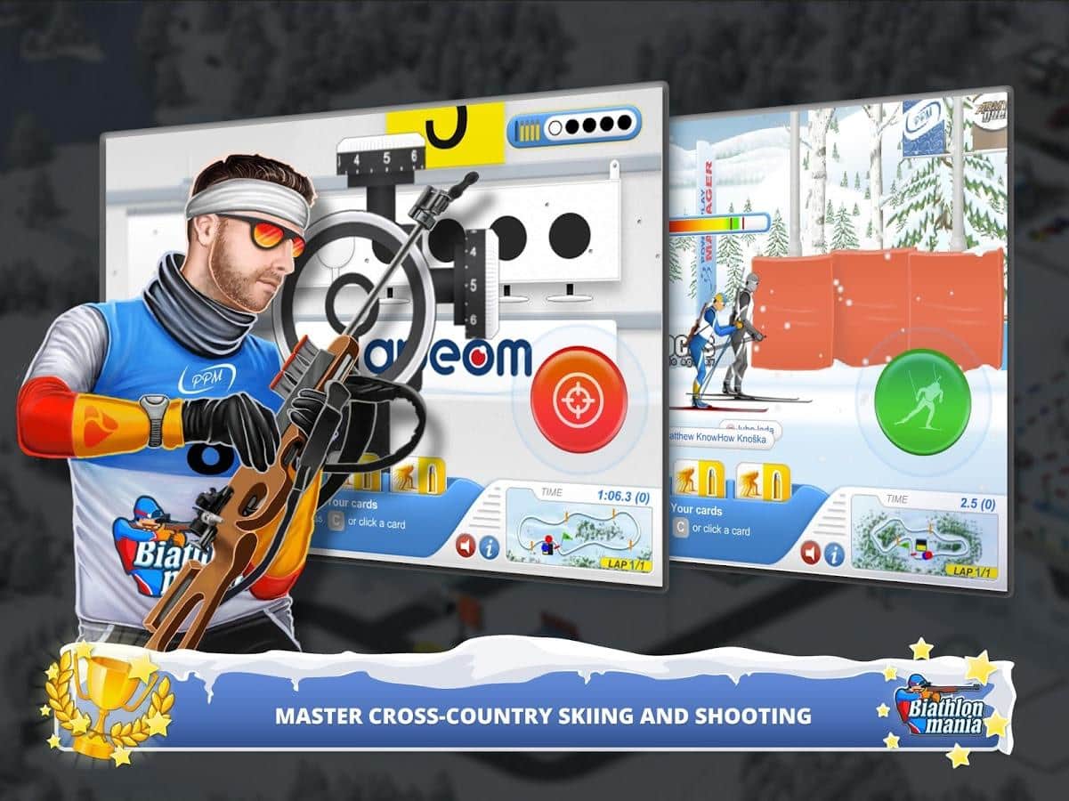 Biathlon Mania – спортивная игра на андроид, где вы примите свое участие в соревнованиях по биатлону. Создайте своего уникального биатлониста и бегайте на лыжах по заснеженным трассам и метко стреляйте по мишеням. Откройте для себя уникальный и неповторимый мир биатлона, где ваша победа будет складываться из многих показателей бега и стрельбы. Тренируйте своего чемпиона и добейтесь рекордных результатов, которые помогут вам завоевать призовые места в чемпионате. Примите свое участие в различных чемпионатах и поборитесь со знаменитыми звездами биатлона. Метко стреляйте по мишеням и приходите к финишу первым, повышая свой рейтинг и получая возможность приобрести лыжи, винтовки и другое снаряжение.