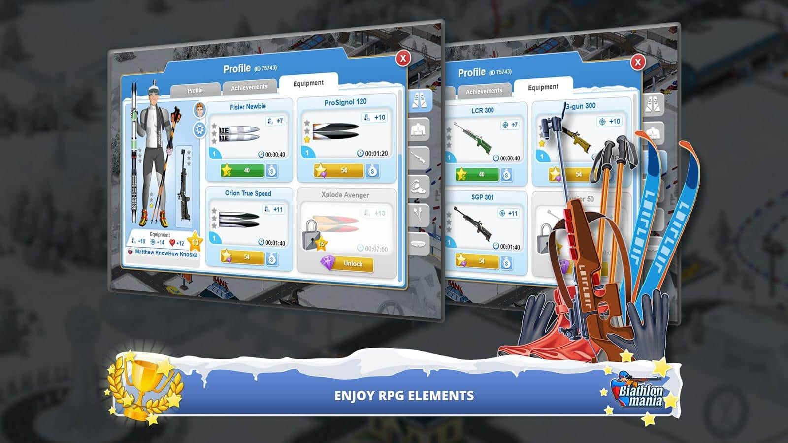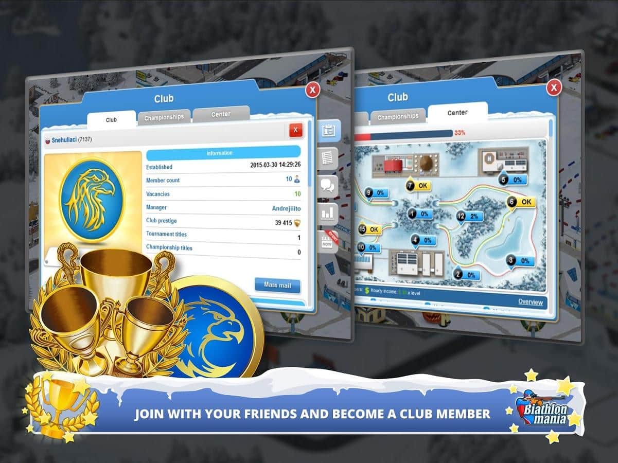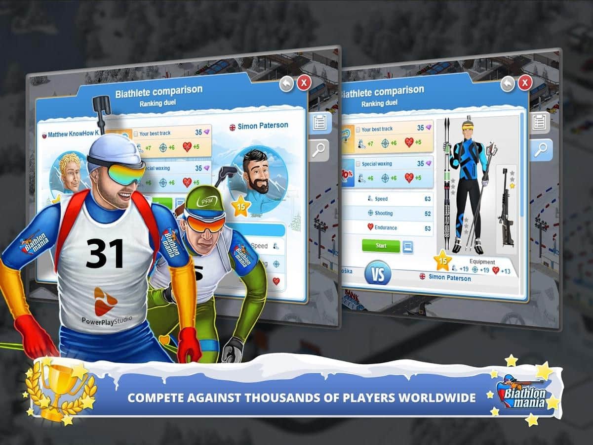 Biathlon Mania – спортивная игра на андроид, где вы примите свое участие в соревнованиях по биатлону. Создайте своего уникального биатлониста и бегайте на лыжах по заснеженным трассам и метко стреляйте по мишеням. Откройте для себя уникальный и неповторимый мир биатлона, где ваша победа будет складываться из многих показателей бега и стрельбы. Тренируйте своего чемпиона и добейтесь рекордных результатов, которые помогут вам завоевать призовые места в чемпионате. Примите свое участие в различных чемпионатах и поборитесь со знаменитыми звездами биатлона. Метко стреляйте по мишеням и приходите к финишу первым, повышая свой рейтинг и получая возможность приобрести лыжи, винтовки и другое снаряжение.
