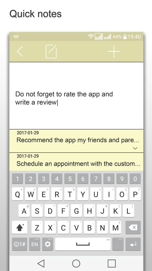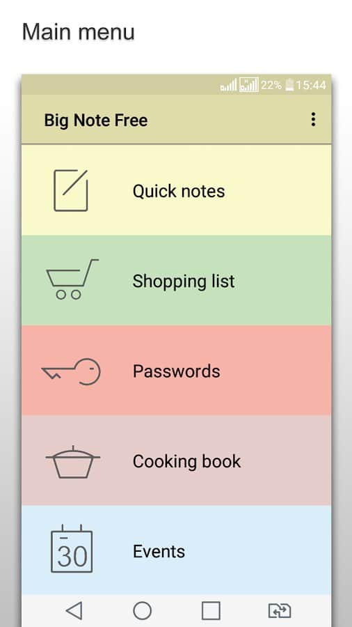 Big Note Free - Notepad database - Больше не нужно использовать целую кучу различных приложений, с помощью этого многофункционального блокнота вы сможете намного больше. Здесь вы найдете такие функции как: быстрые заметки, список покупок, пароли, кулинарный блокнот а так же важные события. Все эти возможности могут предоставить различные приложения, однако здесь это все собрано в кучу, к тому же вы можете защитить свои личные записи при помощи пароля.