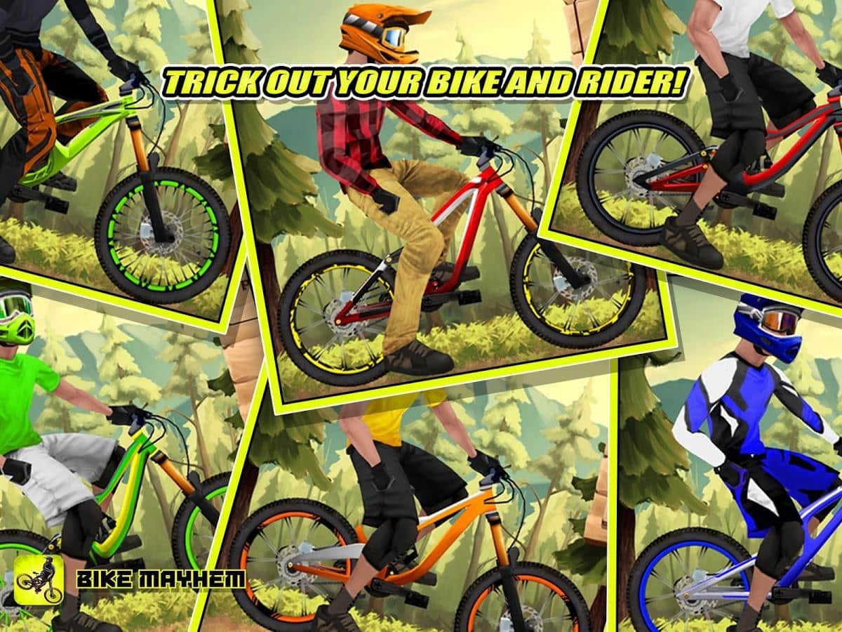 Bike Mayhem Mountain Racing - Сумасшедшие велосипедные гонки с трюками на андроид. Вы будете кататься по горным местностям с трамплинами и выполнять различные трюки. Игра порадует не плохим набором снаряжения, которое вы сможете открыть по ходу прохождения игры. Вас ждет 18 различных горных местностей, среди которых проложено около сотни различных маршрутов для заездов, а также более 80 аксессуаров для вашего байка и велосипеда.