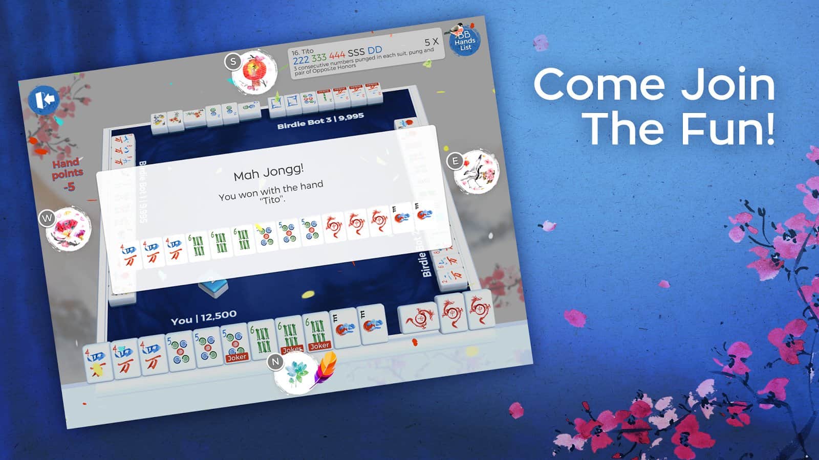 Birdie Bam Mah Jongg – классический американский маджонг на андроид, где вашей задачей будет набрать максимальное количество очков. В этой игре вам будут даваться кости напоминающие домино и вам предстоит собрать выгодную комбинацию из определенного количества костей. Играйте против компьютера или со своими друзьями и весело проводите свое свободное время. Для этой игре вам потребуются такие качества как хорошая память, наблюдательность и опыт. Набирайте максимальное количество очков и выигрывайте турнир. Тренируйте свои навыки в этой игре и добивайтесь отличных результатов, поднимаясь все выше в таблице лидеров.