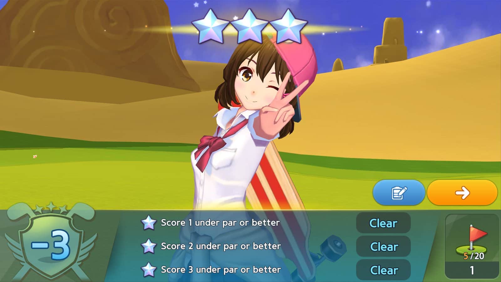 Birdie Crush CBT – спортивная игра на андроид, где вы будете играть в гольф. В этой игре вы перенесетесь на живописные и красивые поля, где будете играть в гольф забивая мячи в лунки. Выбирайте себе одного из представленных в игре персонажей и начинайте состязание. Размахивайтесь и бейте клюшкой по мячу с разной силой, оценивая при этом правильность траектории полета. Познакомьтесь с милыми персонажами кэдди, которые на протяжении всей игры будут помогать вам и давать нужные советы. Открывайте для своего персонажа многочисленные костюмы и сделайте его уникальным. Бросайте вызов реальным игрокам со всего мира или играйте со своими друзьями, устанавливая рекорды.