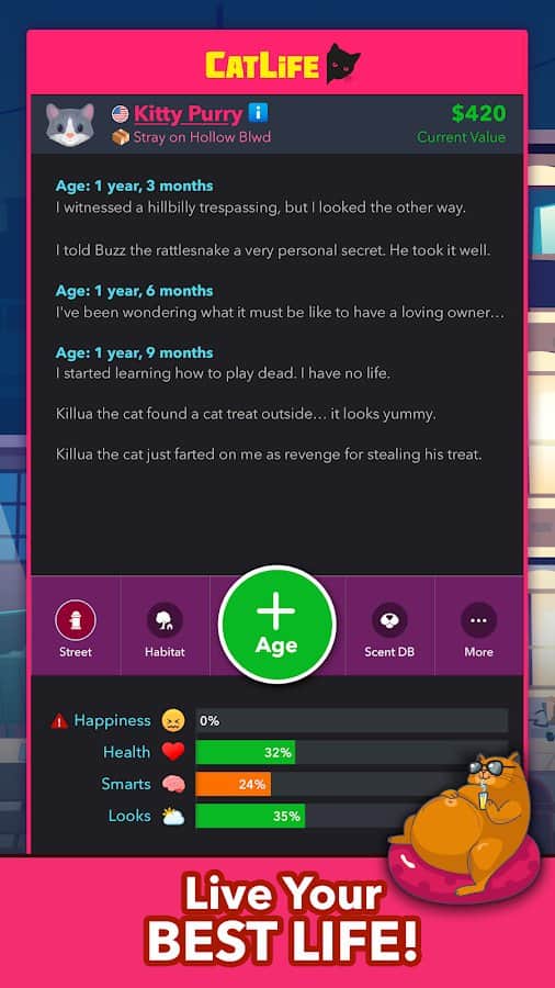 BitLife Cats - CatLife - Станете ли вы дерзким, независимым бездомным котенком, очаровательным влюбленным котенком или компаньоном кошачьей леди, которая немного сумасшедшая в этой интерактивной игре-симуляторе жизни, рассказывающей истории? Ваша история ТВОЯ должна разворачиваться, когда вы взаимодействуете с СОТНИ сценариев на вашем пути, чтобы стать самым милым (или САМЫМ ) котенком в городе. Эта захватывающая игра заставит вас вернуться еще раз - нет двух одинаковых жизней CatLife!