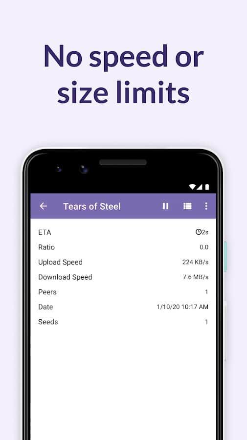 BitTorrent® Pro - Torrent App - Один из самых популярных торрентов в мире теперь и на вашем смартфоне. Все что вам нужно это установить данное приложение и вы уже можете качать файлы. Оно совершенно бесплатно, и не требует специальных прав, просто качаете торрент файл, запускаете его и скачивание начинается. Простой и удобный интерфейс так же являются большим плюсом, а в совокупности со скоростью работы данного приложения, вы точно выберете его.