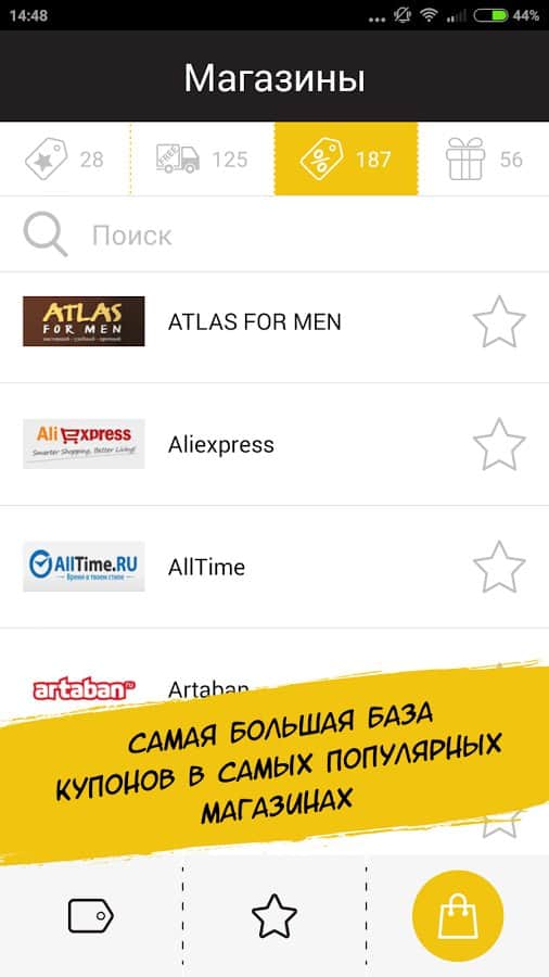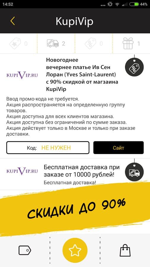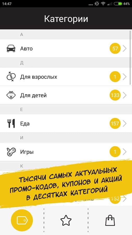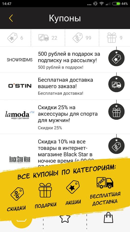 Что же делать, когда пройдет «День Ч»? Безвозвратно удалять приложение до следующего года? Ни в коем случае – после завершения BlackFriday приложение позволяет следить за всеми онлайн-акциями: вы всегда будете в курсе самых актуальных скидок и распродаж. С помощью программы вы сможете собрать и сохранить все интересующие вас промокоды по выбранным категориям, чтобы использовать их немедленно через мобильный интернет или ввести позже на десктопных версиях сайтов.