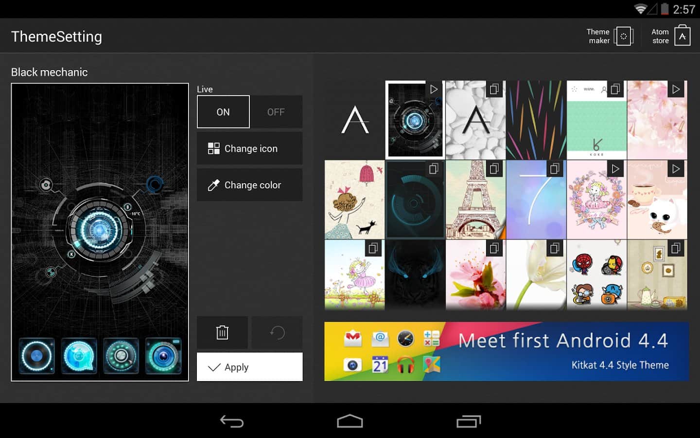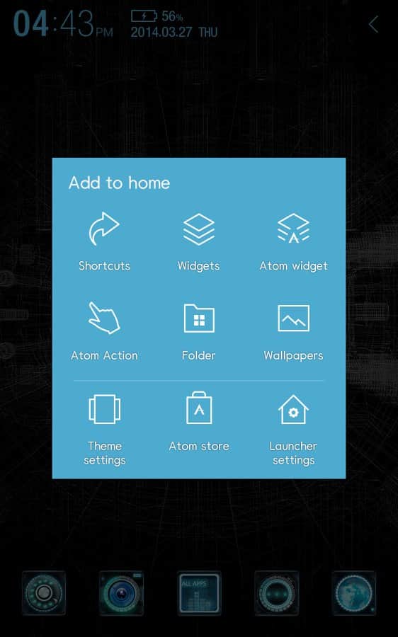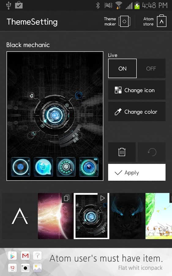 Black mechanic Atom Theme - Отличная тема для Atom лаунчера, исполненная в черном цвете и с уймой различных дополнений. Ядро по центру вашего экрана и уникальный вид иконок заставят вас почувствовать себя владельцем настоящего робота, который послужит вас в любом деле. Однако ваш рабочий стол будет смотреться не только круто но и весьма элегантно, так как здесь идеально проработано сочетание цветов.