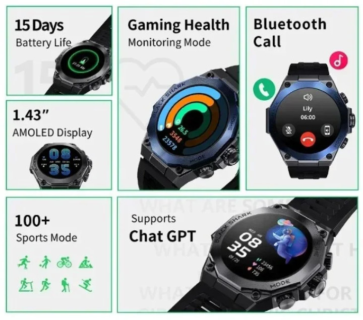 Часы предлагают более ста циферблатов и полный набор датчиков отслеживания здоровья, в том числе, мониторинг сердечного ритма, уровня кислорода в крови, отслеживание качества сна и другое. Часы могут распознавать более сотни спортивных режимов, видимо, чтобы расшевелить любителей мобильного гейминга. Из интересного — модель S1 Pro предлагает интеграцию с ChatGPT. Есть возможность совершать и принимать звонки через Bluetooth.