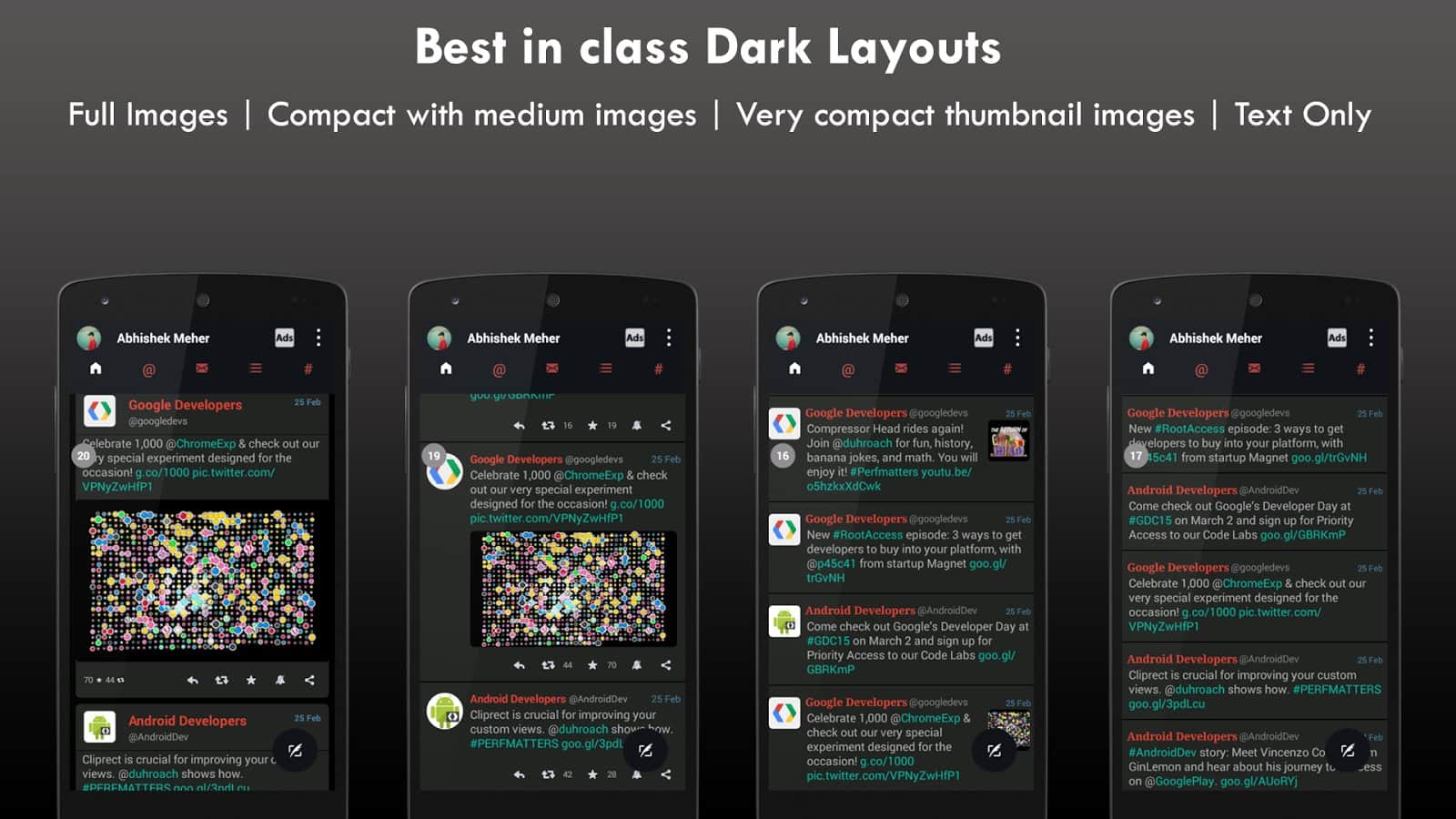 В оформлении имеется темная и светлая темы оформления, а также несколько макетов отображения твитов, на ваш выбор.