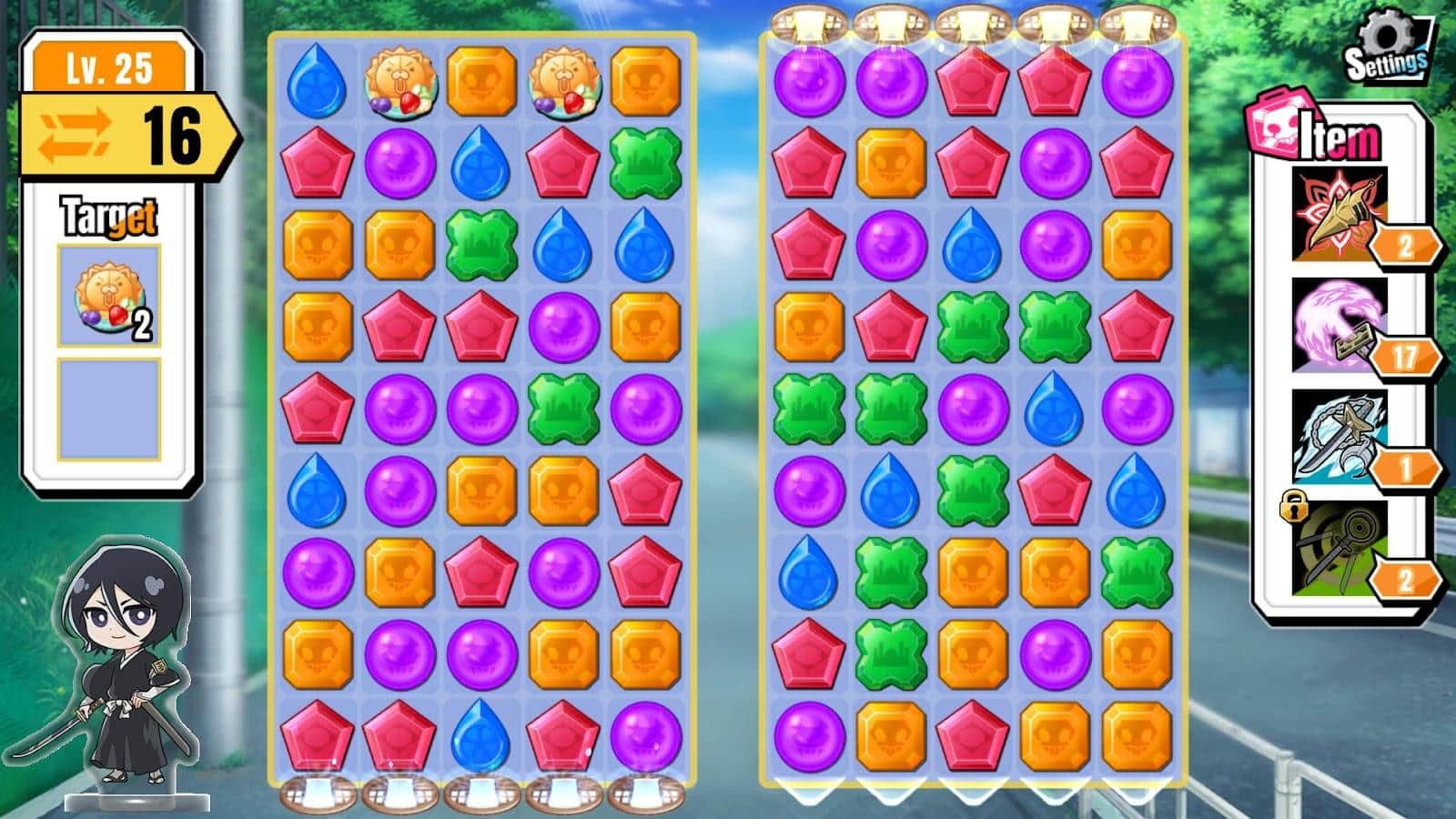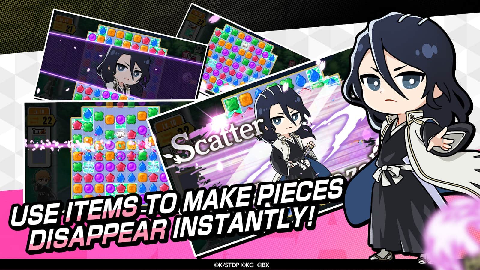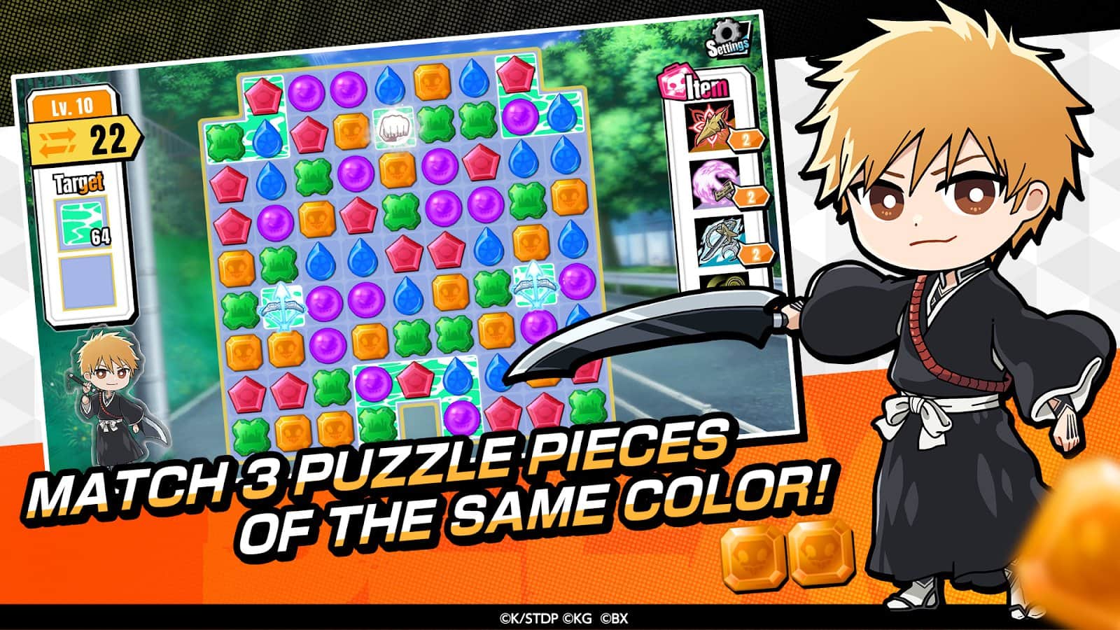 BLEACH Soul Puzzle - три-в-ряд по известному аниме. Все любимые персонажи фанатов собрались, чтобы решать здешние головоломки. Весь игровой процесс довольно несложный и простой: вам нужно сопоставлять 3 одинаковых символа в ряд, чтобы они взорвались и сделали вас чуть ближе к цели уровня. Также можно использовать несколько видов предметов,чтобы облегчить ваш игровой процесс. Также вы можете сделать свои комнатки для ваших персонажей. Игра приправлена простой, но милой графикой, а также ненавязчивой и спокойной музыкой.
