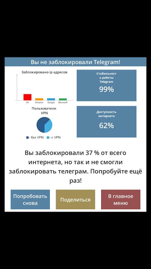На сегодняшний день борьба Роскомнадзора с различными вредоносными, на их взгляд, ресурсами является одной из самых актуальных тем на просторах Интернета. А попытка заблокировать популярный мессенджер Telegram стала настоящей эпопеей. Создатели приложения под названием Блокировка Telegram дали нам возможность самим опробовать силы в борьбе с коварным мессенджером. При этом игровая механика построена по принципам текстовых стратегий, а разработчикам удалось довольно гармонично разбавить геймплей юмором и рядом интересных фич.