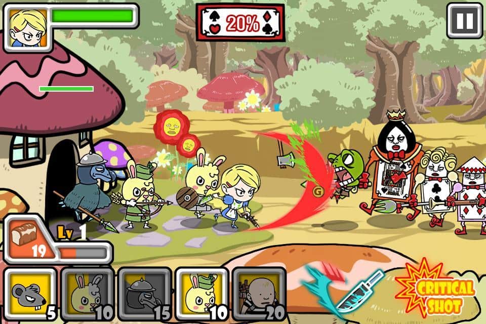 Bloody Alice Defense - в этом 2D аркадном экшене для андроид вы столкнетесь с необычной интерпретацией милой и доброй сказки "Алиса в стране чудес". Местная Алиса - девочка не из робкого десятка и ее боевому духу можно только позавидовать. Чтобы справиться с пакостями Королевы, Алиса взяла в руки оружие и отправилась наводить свои порядки! Для начала в руках воинственной Алисы оказались пистолет и мачете - не очень женское оружие, но что было...Чем дальше будет проходить героиня, тем больше возможностей у нее появится, например, вызов помощников - мышей, кроликов-мечников, супер-птиц и шляпника и пр. Но для этого надо большие запасы хлебных крошек! После удачных сражений вы сможете прокачать своих воинов или же прикупить что-нибудь новенькое для самой Алисы! Начинайте свой кровавый путь маленькой, но боевой девчушки!