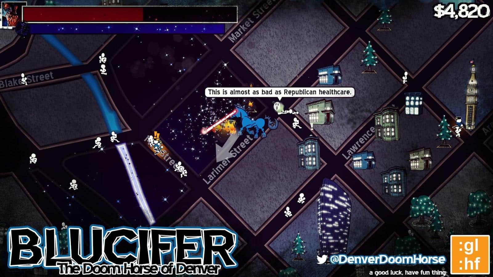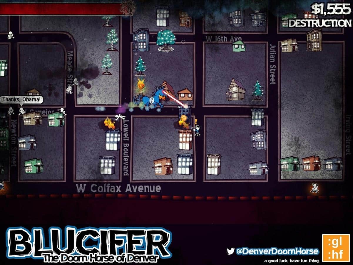 Blucifer: The Doom Horse of Denver - динамичная экшен аркада с видом сверху события которой развиваются в Американском городе Денвер. По словам очевидцев у подножья Скалистых гор появился некий пегас который уничтожает все на своем пути, именно в роли этого создания вам и предстоит играть. Вооружитесь мистическим лучом смерти и сокрушайте целые жилые кварталы, технику и даже города. Данная игра отлично подойдет для того чтобы скоротать несколько свободных часов.